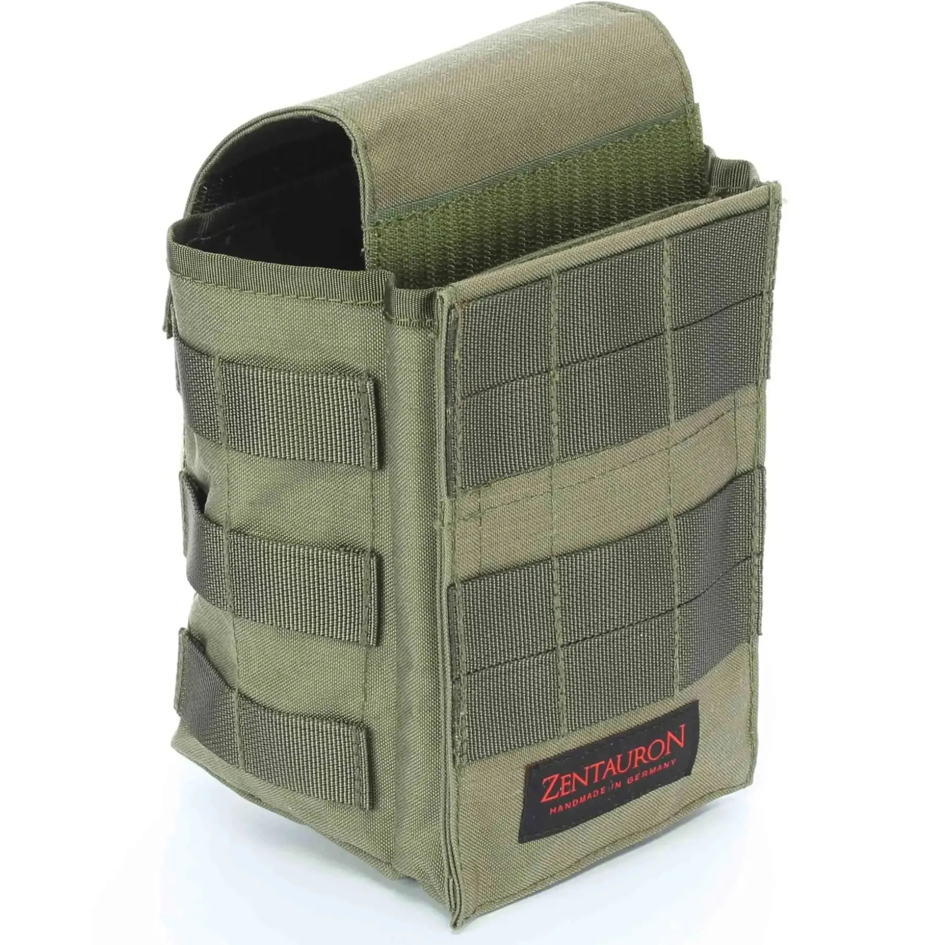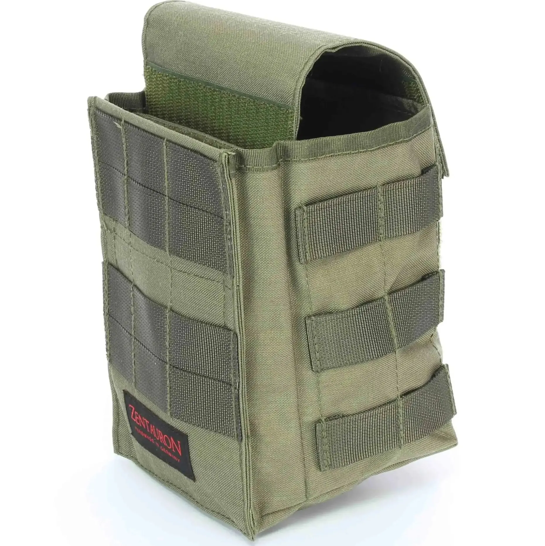 Die Zentauron Mehrzwecktasche Multislot wird via den mitgelieferten zwei Molle-Clips und mit den Molle-Schlaufen auf der Rückseite an Plattenträger und Schutzwesten angebracht. Sie zeichnet sich durch zahlreiche Fächer und großen Stauraum aus. Das Hauptfach kann zum Beispiel zwei Nebeltöpfe DM25, vier Magazine für das Gewehr G36 oder bis zu sechs Magazine für das Gewehr M4 aufnehmen. Zudem befindet sich hinter dem Hauptfach der Multislot, ein Fach, das beispielsweise Platz für flache Funkgeräte oder Signalpistolen bietet. Aufgrund des Klett-Verschlusses bleibt es in leerem Zustand stets verschlossen. Die höhenverstellbare Verschlussklappe befindet sich auf der Oberseite und ist im Inneren mit Klett befestigt. Folglich lässt sie sich ideal auf den Inhalt der Mehrzwecktasche einstellen und ermöglicht ein stabiles Verstauen. Außerdem befindet sich am Boden der Tasche eine Wasserablauföse. Zur Befestigung von weiterer Ausrüstung und Molle-Taschen sind an den Seiten der Mehrzwecktasche Multislot weitere Molle-Schaufen angebracht.