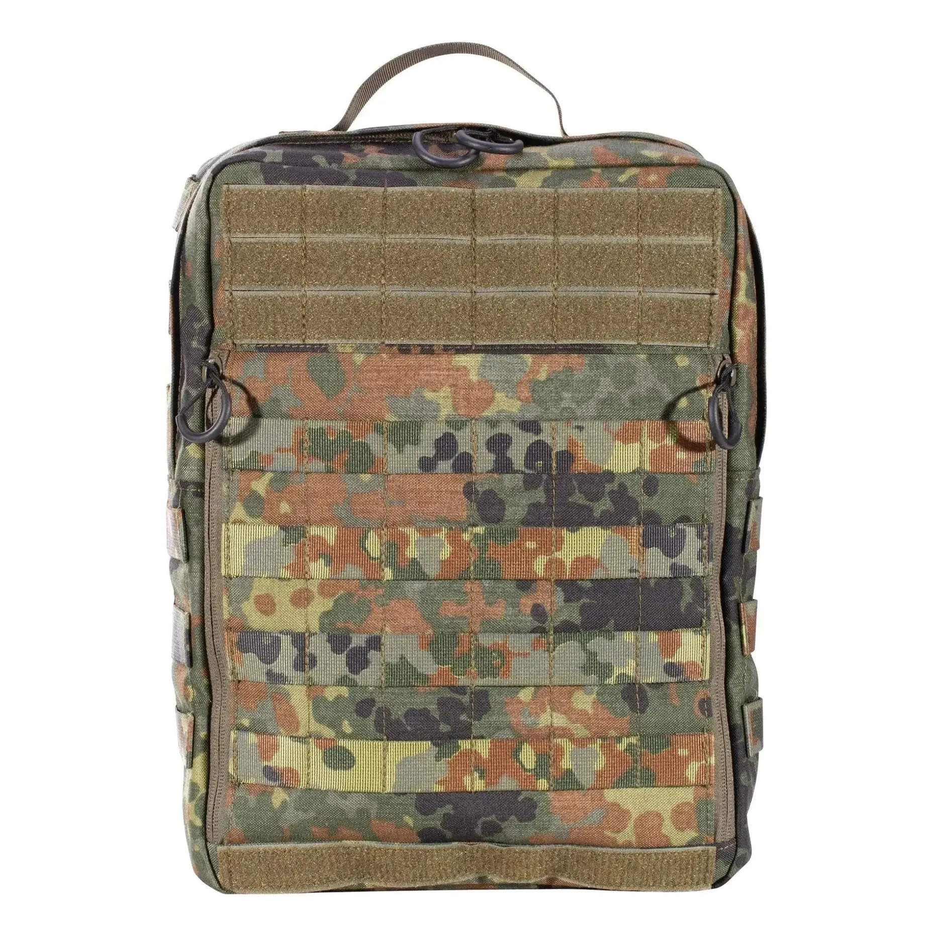 Der Zentauron Rucksack Clip On Battle Pack kann sowohl als normales Daypack getragen werden wie auch als praktische Erweiterung für Plattenträger und Schutzwesten dienen. In einem großen Fach auf dem Rücken kannst Du problemlos Deine Ausrüstung verstauen. Außerdem bietet es Platz für eine mit Klett fixierbare Wasserblase mit einem Volumen von bis zu 3 Litern. Ein Auslass für Schläuche, Kabel und Antennen befindet sich unter dem Haltegriff des Deckels. Auf der Vorderseite sind zwei kleinere Reißverschlussfächer mit 4 x 6 Molle-Schlaufen angebracht. Hier lassen sich Gegenstände wie Taschenlampen und Handschuhe unterbringen. An 3 x 6 Klett-Molle-Schlaufen kannst Du weitere Ausrüstung und Patches integrieren.