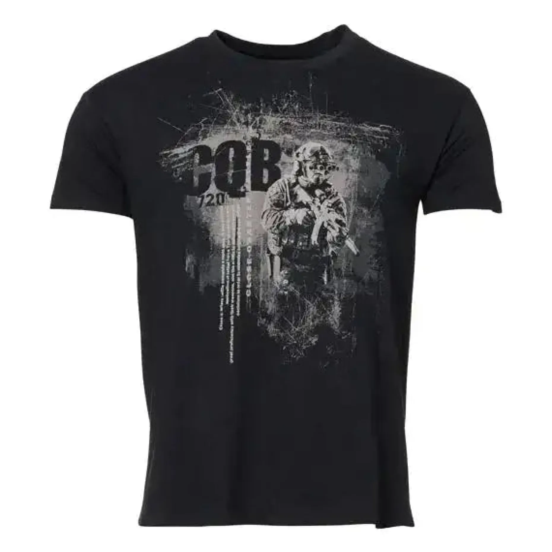 Der Schriftzug „Close Quarter Battle“ kurz CQB bedeutet Nahkampf. Mit 720er Schriftzug auf dem Oberarm und Logo-Print im Nacken.