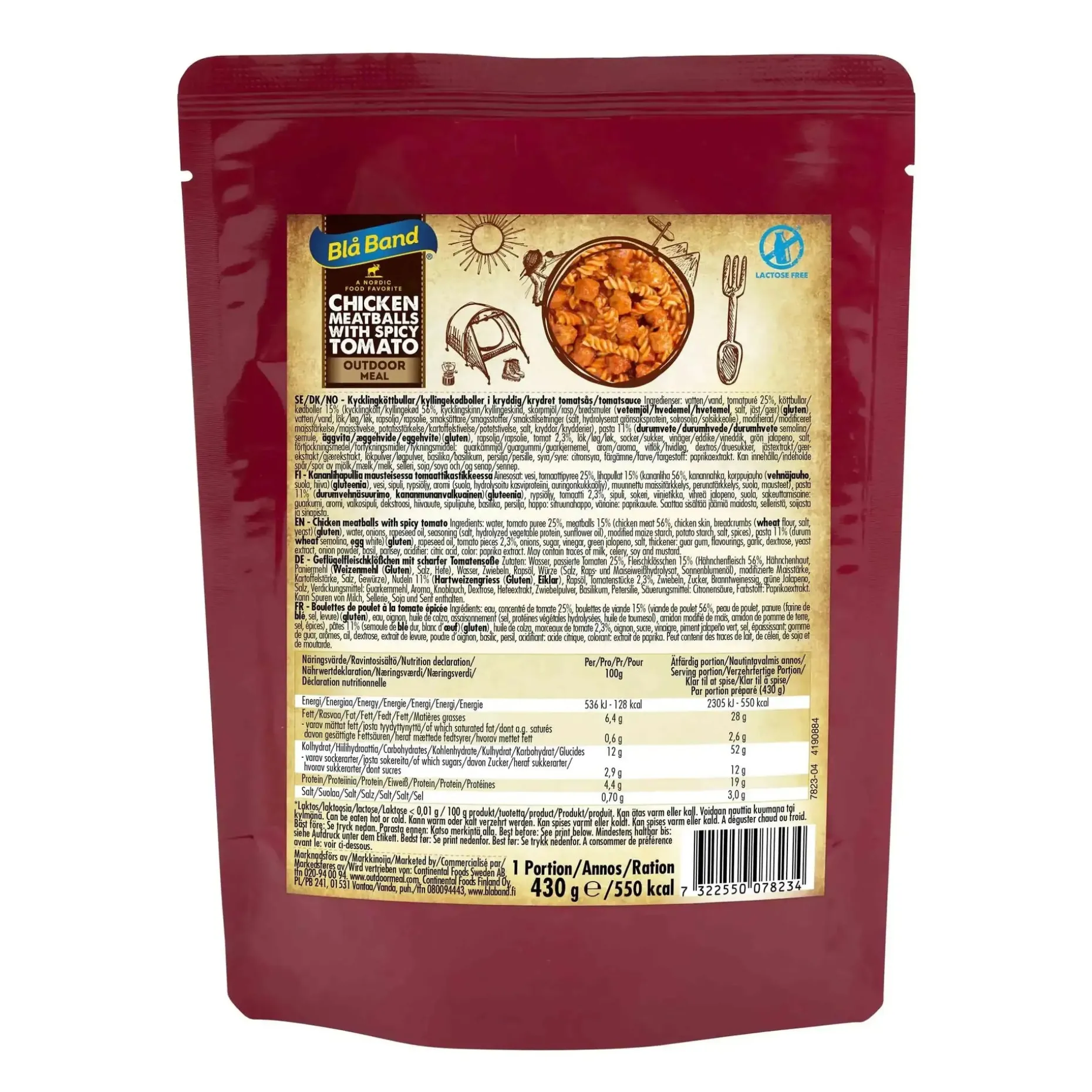 Hühnchenfleischklöße sind eine schmackhafte und nahrhafte gefriergetrocknete Mahlzeit. Die Mahlzeit beinhaltet keine Geschmacksverstärker und bietet so nur einen geringen geschmacklichen Unterschied zu gekochten Lebensmitteln. Um den Geschmack so wenig wie möglich zu verändern, verwendet Bla Band frische Zutaten, die alle getrennt voneinander gefriergetrocknet werden.