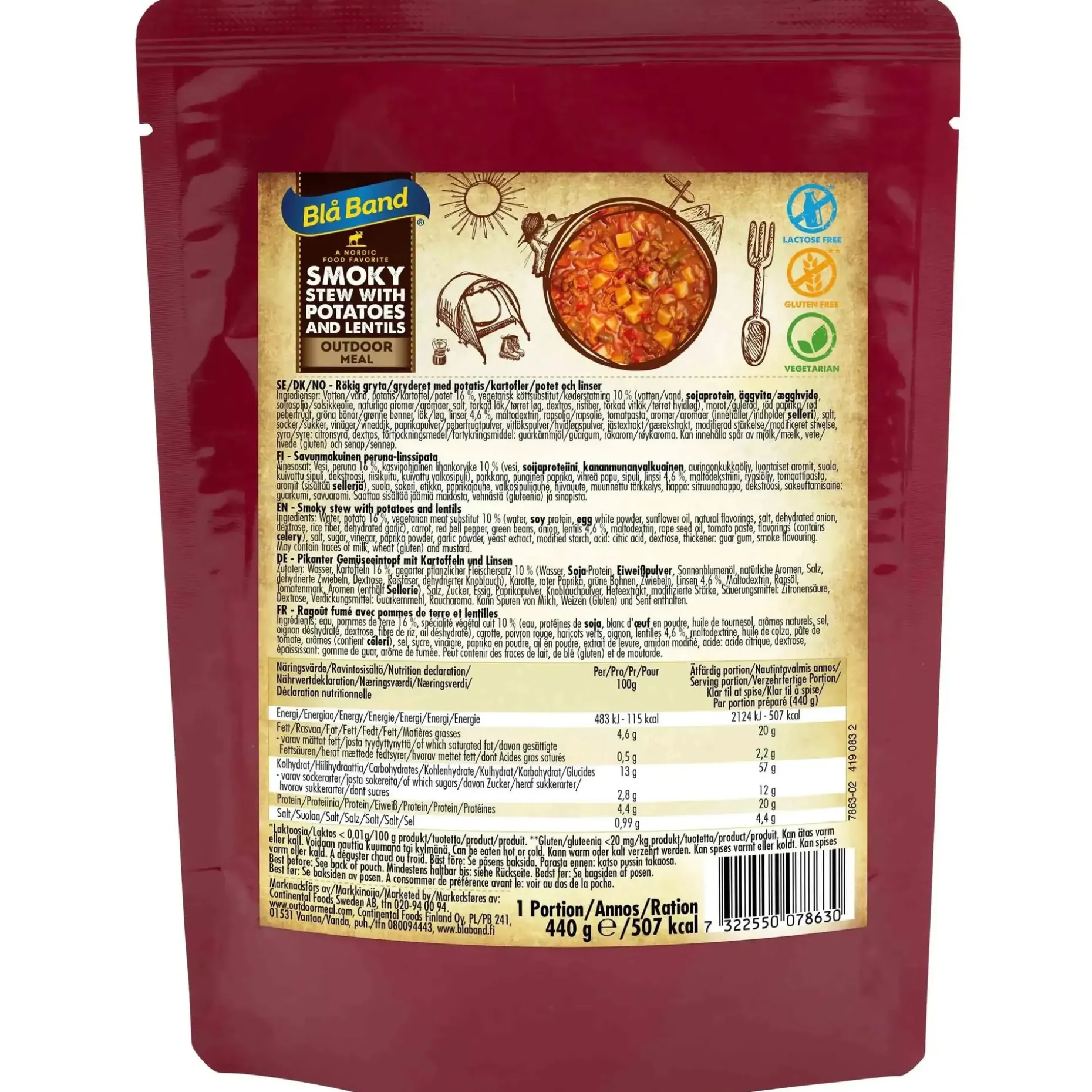 Der Bla Band Linseneintopf mit Kartoffeln ist ein schmackhaftes, vegetarisches und gefriergetrocknetes Essen. Die Mahlzeit beinhaltet keine Geschmacksverstärker und bietet so nur einen geringen geschmacklichen Unterschied zu gekochten Lebensmitteln. Um den Geschmack so wenig wie möglich zu verändern, verwendet Bla Band frische Zutaten, die alle getrennt voneinander gefriergetrocknet werden.