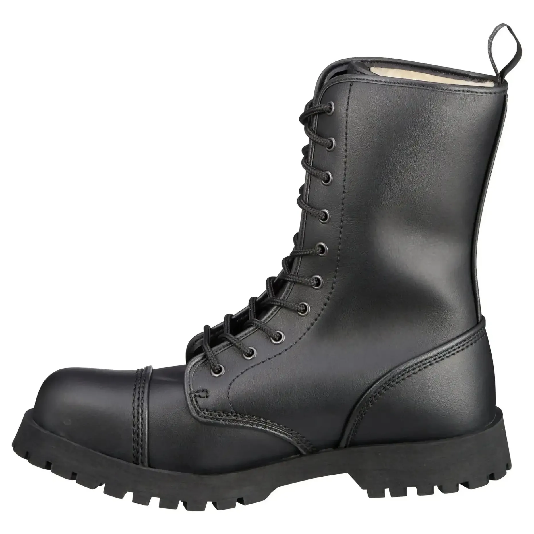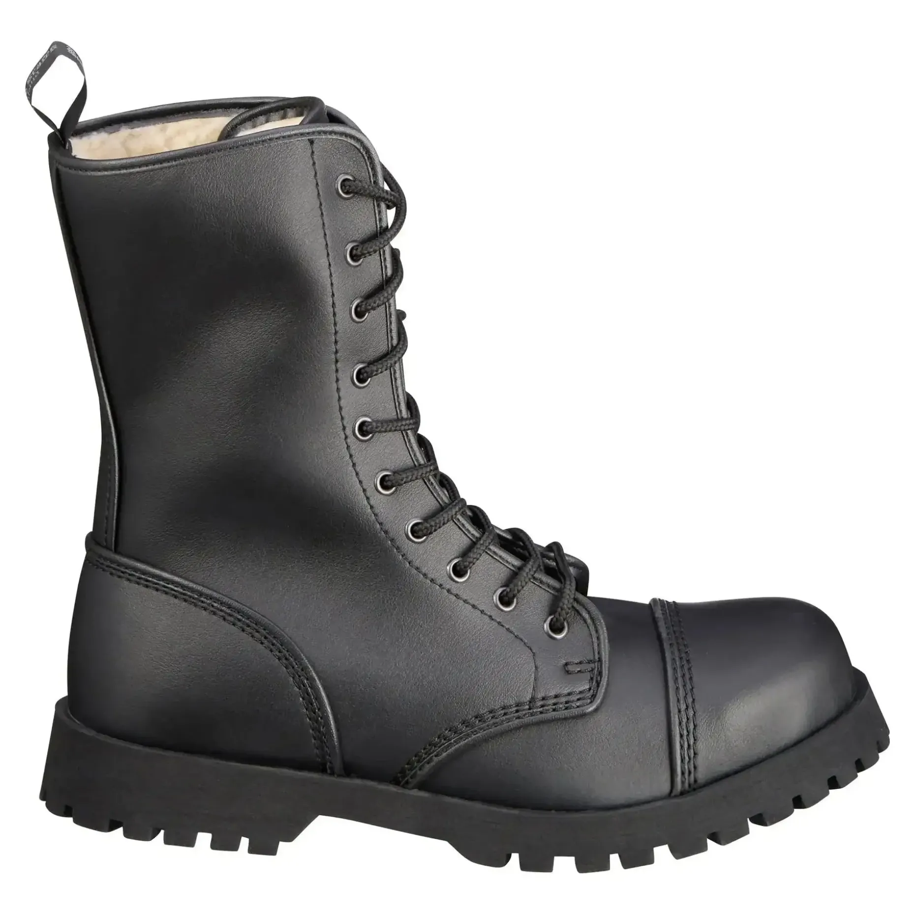 Der Boots & Braces Stiefel 10-Loch Vegetarian Winter schwarz mit Stahlkappe und Quernaht wird ohne tierische Produkte hergestellt. Durch das eingearbeitete Flies bieten die Schuhe einen hohen Tragekomfort und übermäßige Schweißbildung wird vermieden. Das Obermaterial ist ebenso wie das Innenfutter aus atmungsaktivem Synthetik gefertigt. Während die dreifachen Nähte an allen Strukturnahtstellen sie besonders stabil machen, ist die Gummisohle mit Zierschrauben zum besseren Halt ausgestattet. Durch die asymmetrischen Leisten sind sie bequemer als gerade geschnittene Modelle.