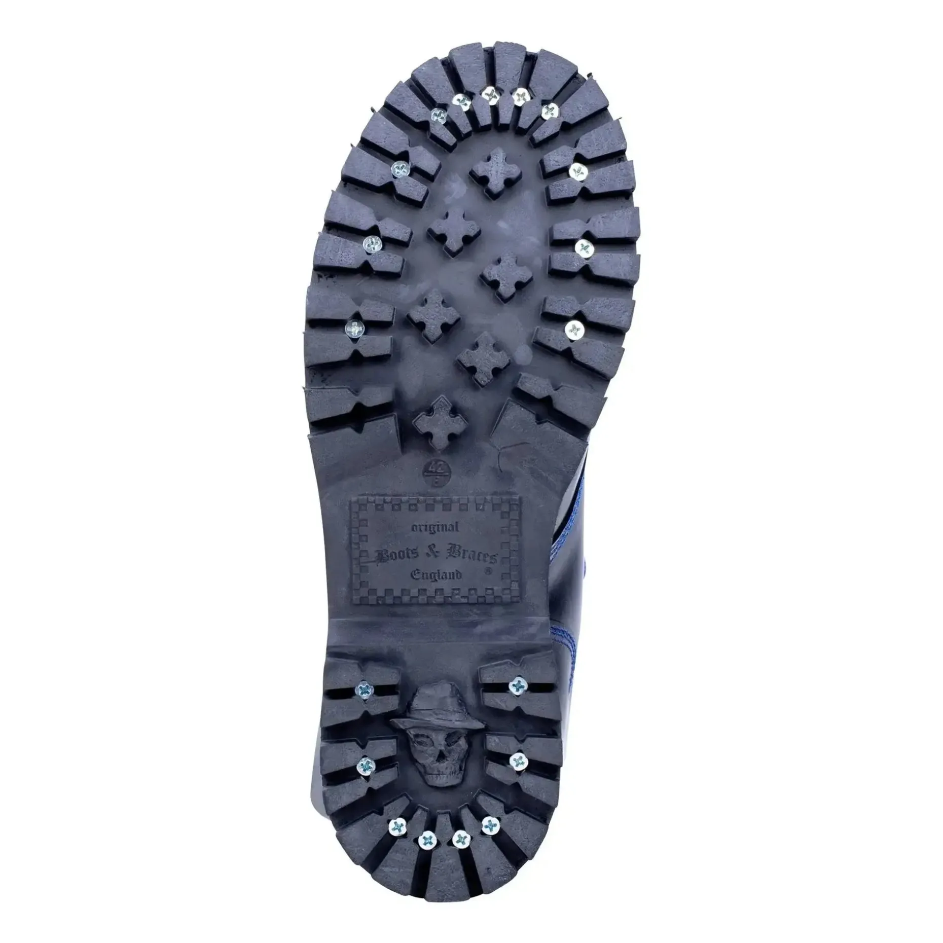 Der Boots & Braces Stiefel 10-Loch blau schwarz mit Stahlkappe und Quernaht überzeugt mit hohem Tragekomfort. Die blauen Schnürsenkel machen ihn zu einem echten Hingucker. Durch die asymmetrischen Leisten sind sie bequemer als gerade geschnittene Modelle. Das Glattleder ist poliert und dementsprechend glänzend. Während die dreifachen Nähte an allen Strukturnahtstellen sie besonders stabil machen, ist die Gummisohle mit Zierschrauben zum besseren Halt ausgestattet.