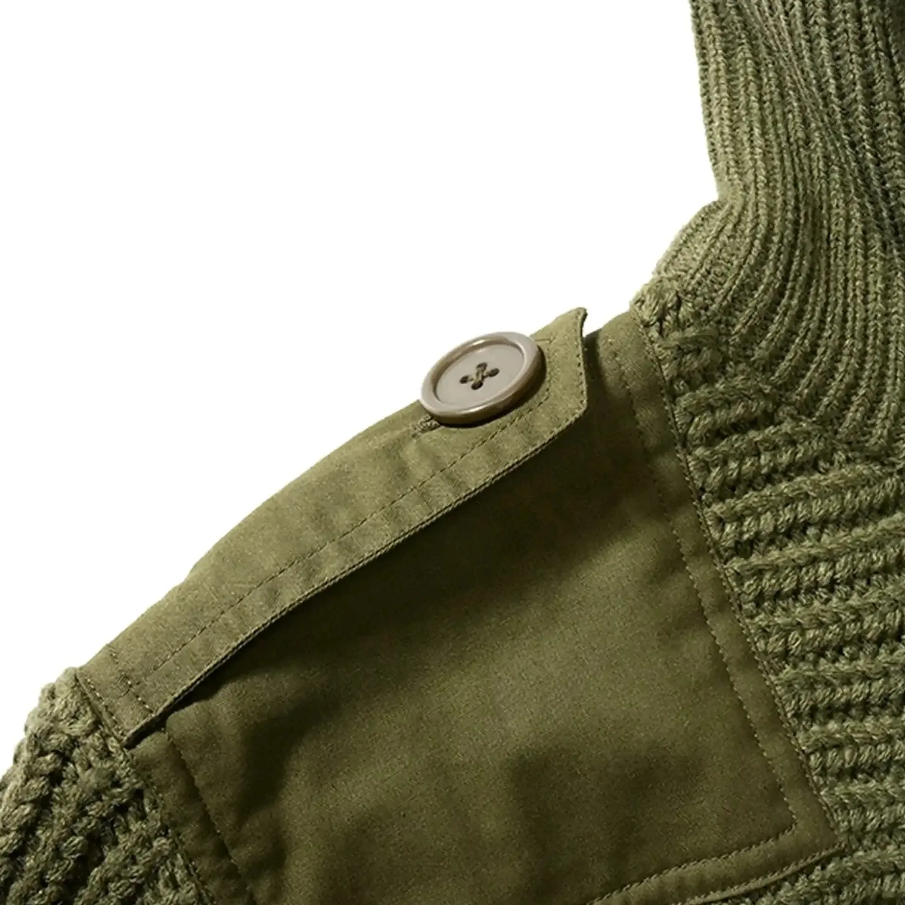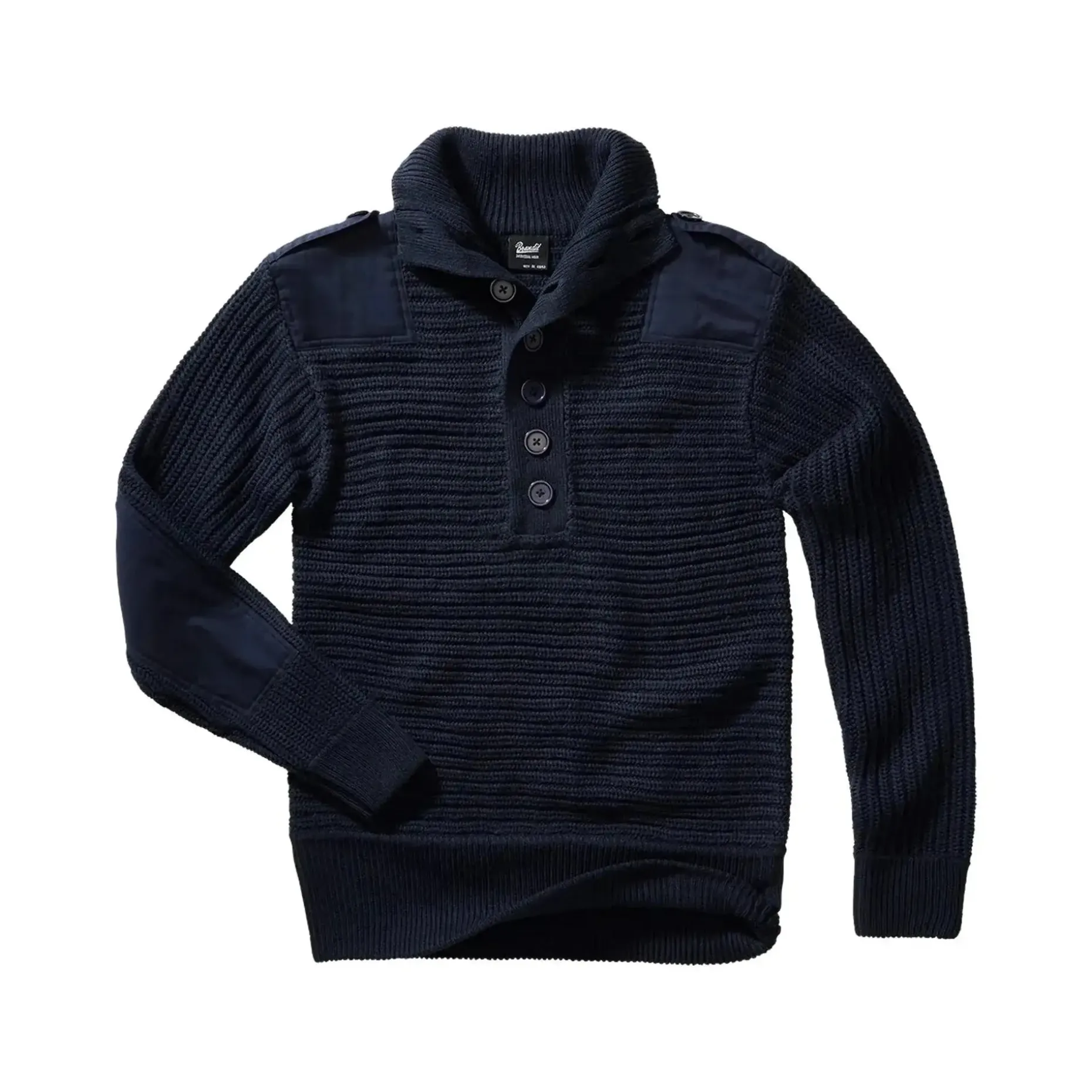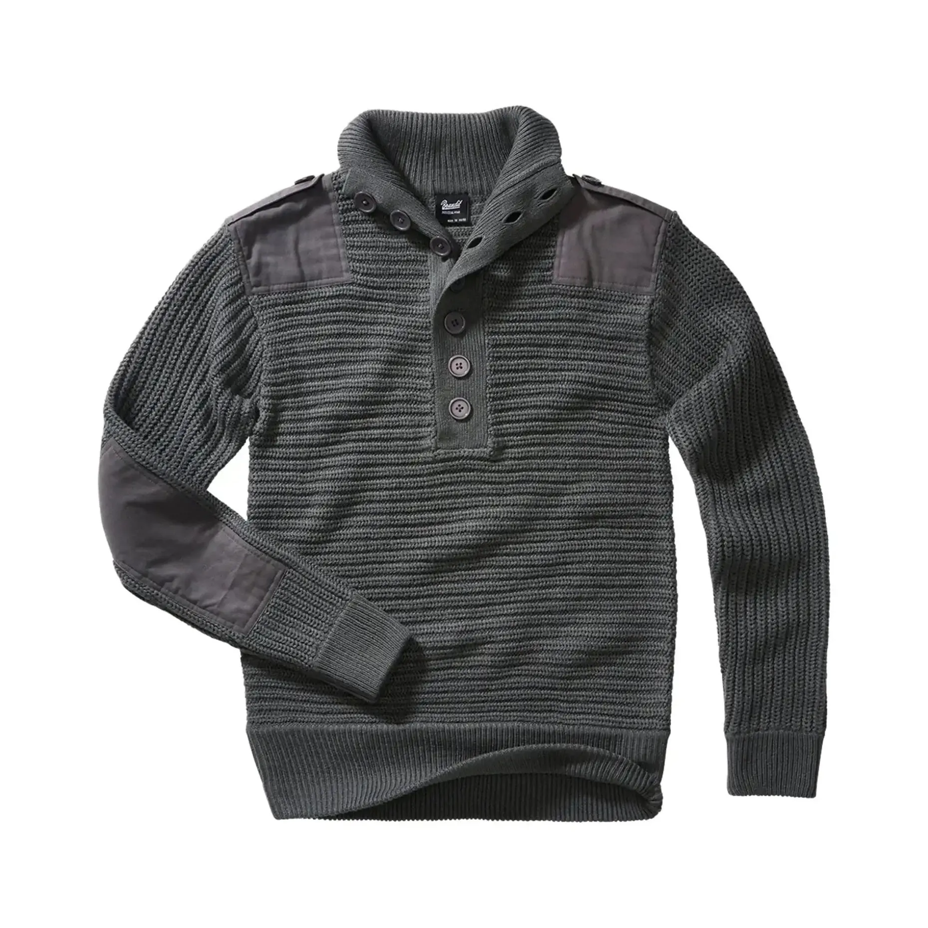 Die breiten Strickbündchen an Ärmeln und Saum sorgen für einen perfekten Sitz und die Knopfleiste am hohen Kragen bietet zusätzlichen Schutz an kalten Tagen. Die Schulterklappen mit Knopfverschluss und die verstärkten Ellenbogen- und Schulterpartien machen den Pullover besonders robust und strapazierfähig.