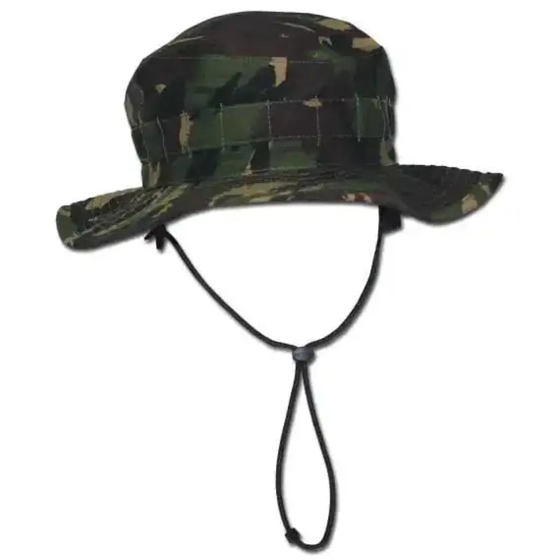 Neuwertiger Tropen-Buschhut aus Original-Beständen der britischen Armee. Das elastische Kinnband ist durch den praktischen Kordelstopper längenverstellbar. Die Krempe lässt sich hochklappen und dient als Sonnenschutz. Rundumlaufende Befestigungsschlaufen für Tarnmaterial.