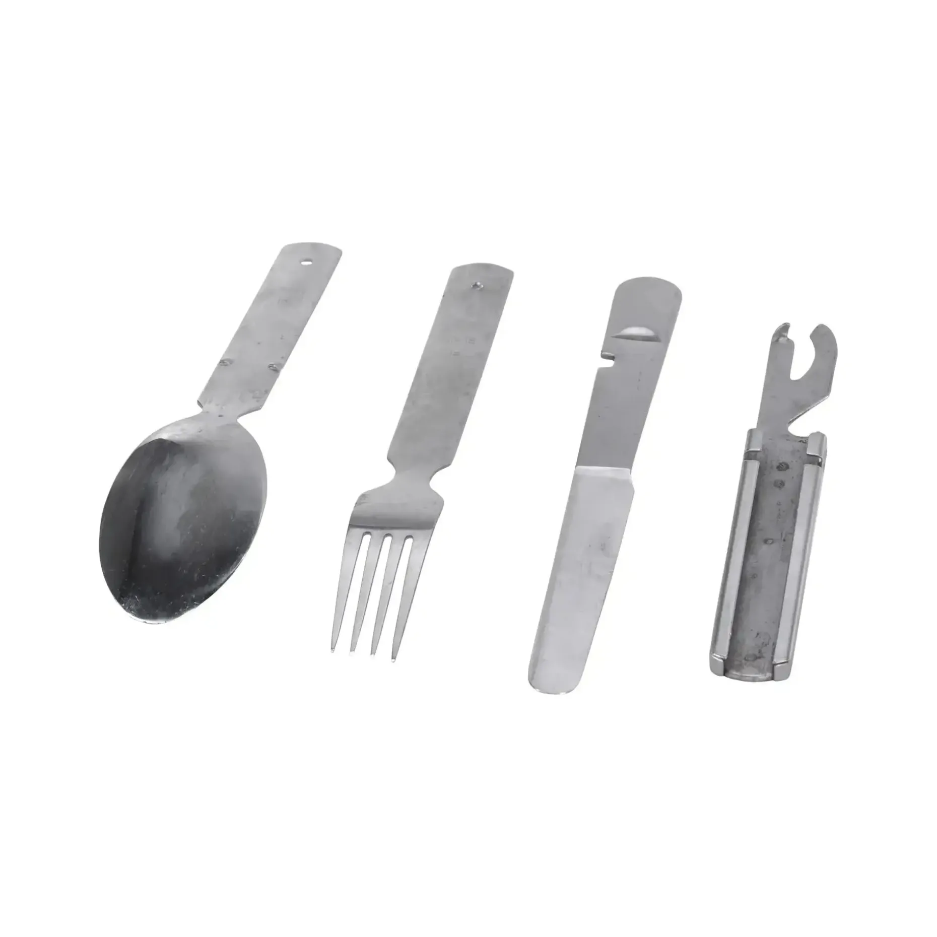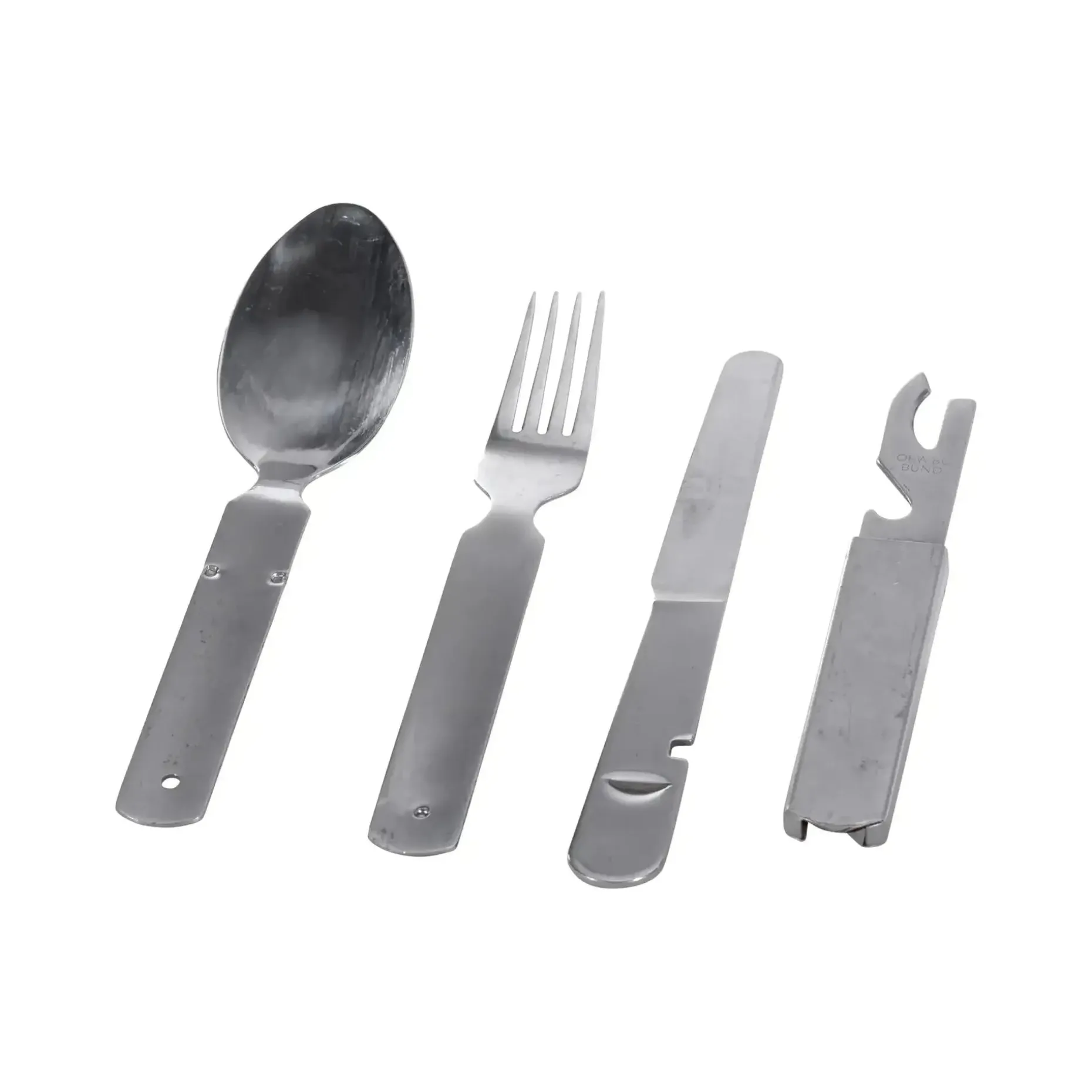 Praktisches Feldessbesteck aus Beständen der Bundeswehr. Dieses klassische Bundeswehr-Besteck besteht aus vier Teilen: Messer, Gabel, Löffel und einer Halterung mit integriertem Dosen- und Flaschenöffner. Alle Bestandteile lassen sich platzsparend ineinander stecken und sind somit ideal für unterwegs geeignet. Robuste Ausführung aus rostfreiem Stahl – konzipiert für den täglichen Einsatz im Feld.