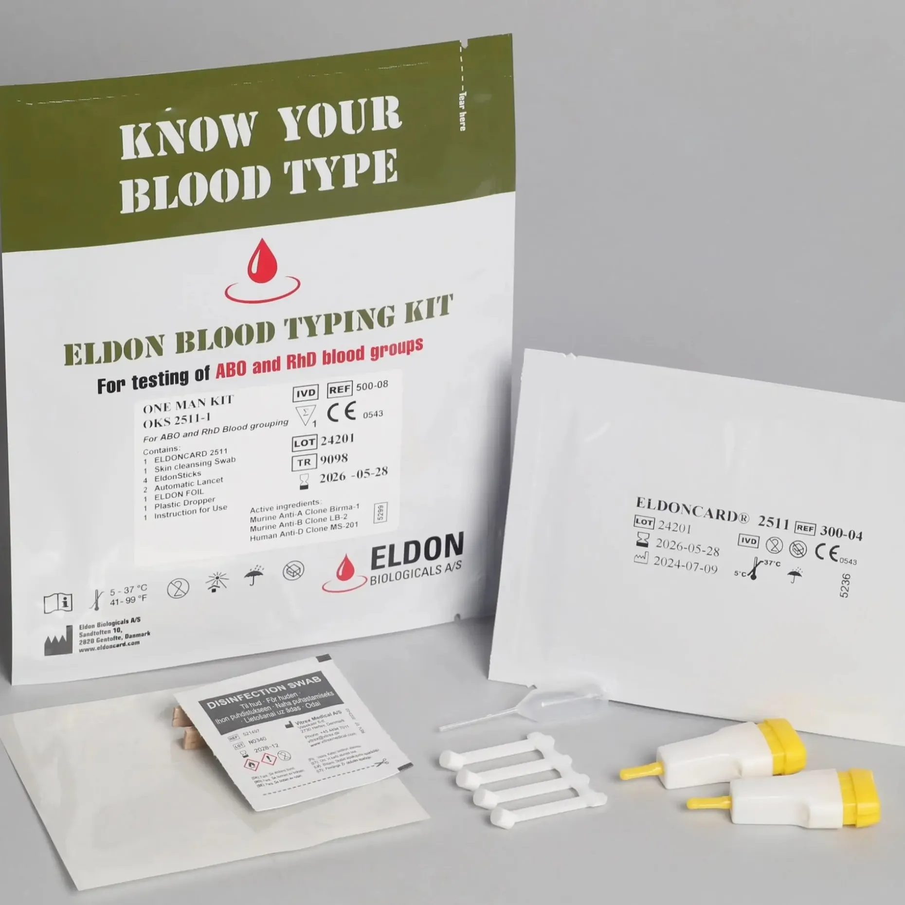 Das Set enthält alles, was Du für eine schnelle und sichere Blutgruppenbestimmung benötigst: die EldonCard, einen sterilen Einweglanzette, Pipette, Alkoholtupfer, vier EldonSticks, EldonFoil sowie eine illustrierte Anleitung zur Durchführung. Das Testergebnis ist bereits nach zwei Minuten ablesbar.
