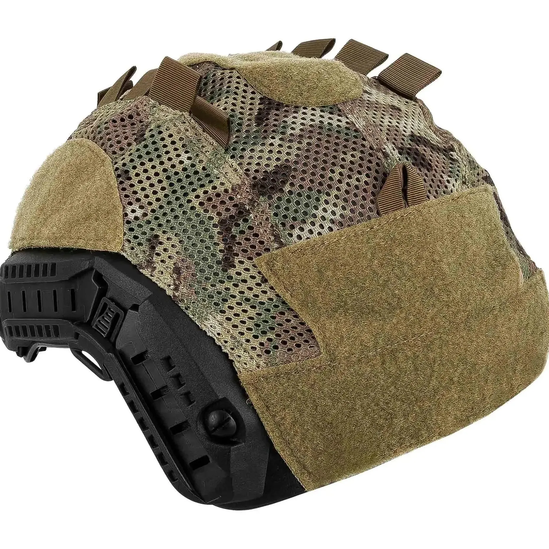 Das Helmcover der Marke FMA ist für den FAST Ballistic oder High Cut Helmet konzipiert. Es besteht aus Cordura sowie Meshgewebe und ist mit Klettflächen zur Anbringung von Patches, Helmlampen oder anderen Accessoires ausgerüstet. Fixiert wird das Cover am Helm mit Hilfe von innenliegenden Klettverschlüssen und zusätzlich mit zwei Bungee-Haken an der NVG-Montage des Helmes. Darüber hinaus ist das Cover mit einem einstellbaren Bungee-Cord ausgestattet, welches es erlaubt, auf dem Helm Ausrüstungsteile z.B. Strobe Lights zu sichern.