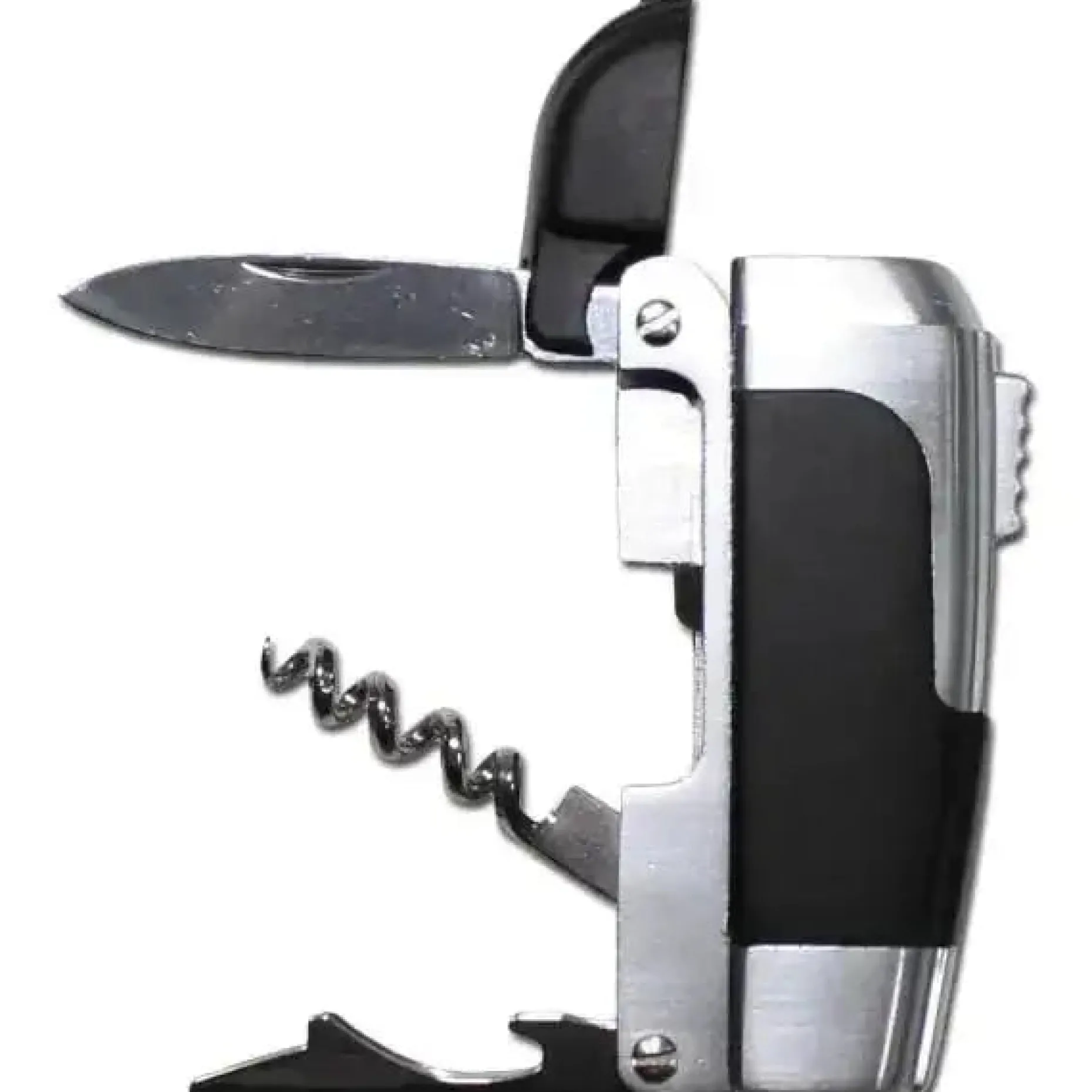 Es handelt sich hierbei um ein übliches Gasfeuerzeug mit Kappe und Schalter, das zusätzlich weitere Werkzeuge beinhaltet. Und zwar: 1 Messerklinge, 1 Korkenzieher und 1 Flaschenöffner. Das Design aus gebürstetem Metall und griffigem Gummi bietet zudem eine edle Optik und macht das Tool sehr robust.