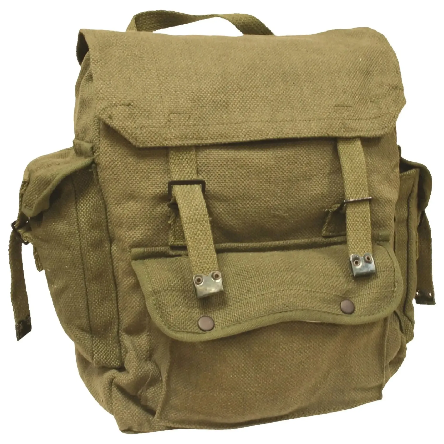 Provianttasche/Rucksack aus robustem Baumwoll-Segeltuch, mit verstellbaren Gurten, Fronttasche mit Druckknopfverschluss und seitlichen Taschen mit Riemenverschluss.