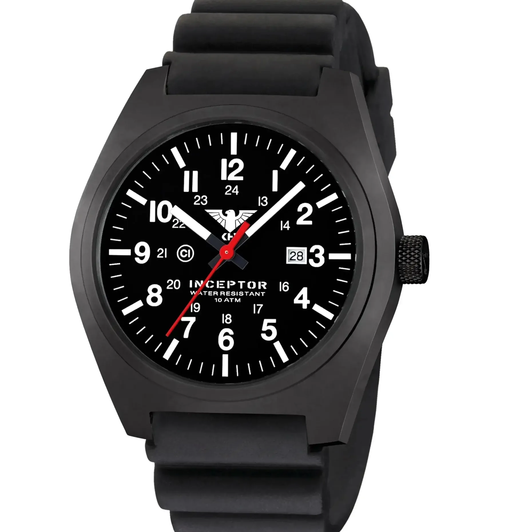 – Zifferblatt und Zeiger: matt schwarzes Zifferblatt, 3 Zeiger, roter Sekundenzeiger für taktische sekundengenaue Einsätze
