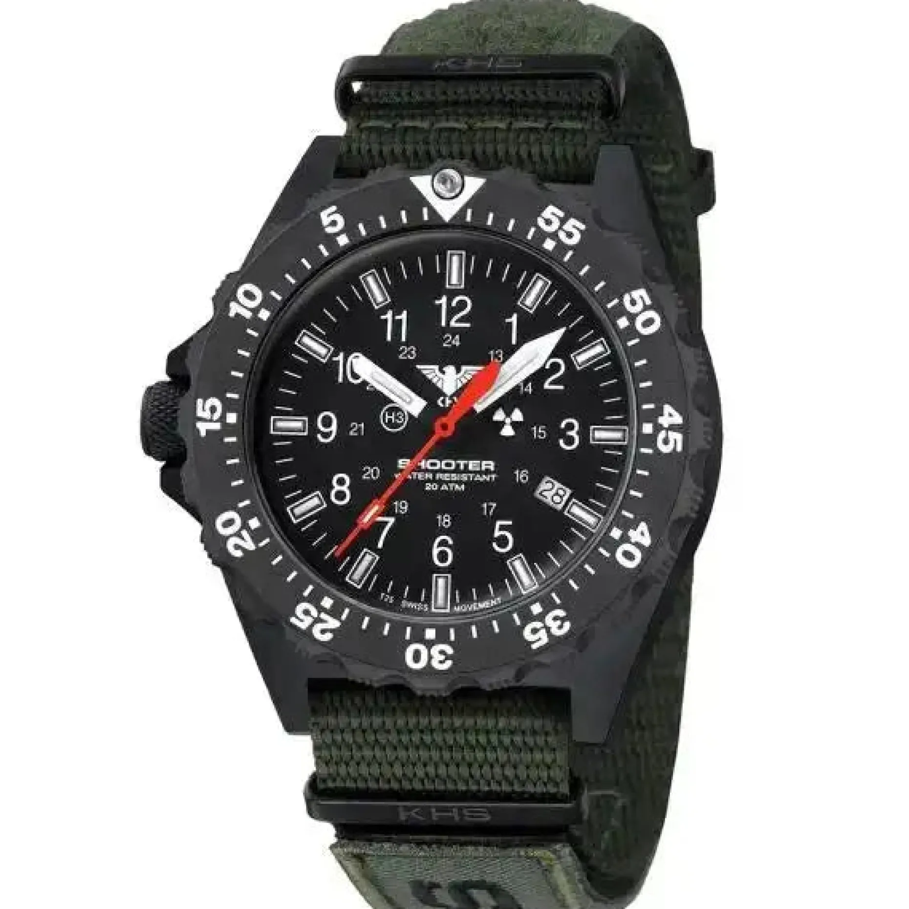 – Zifferblatt und Zeiger: matt schwarzes Zifferblatt mit arabischen Ziffern und Datumsfenster, 3 Zeiger (Stunde, Minute und Sekunde), roter Sekundenzeiger für taktische sekundengenaue Einsätze.