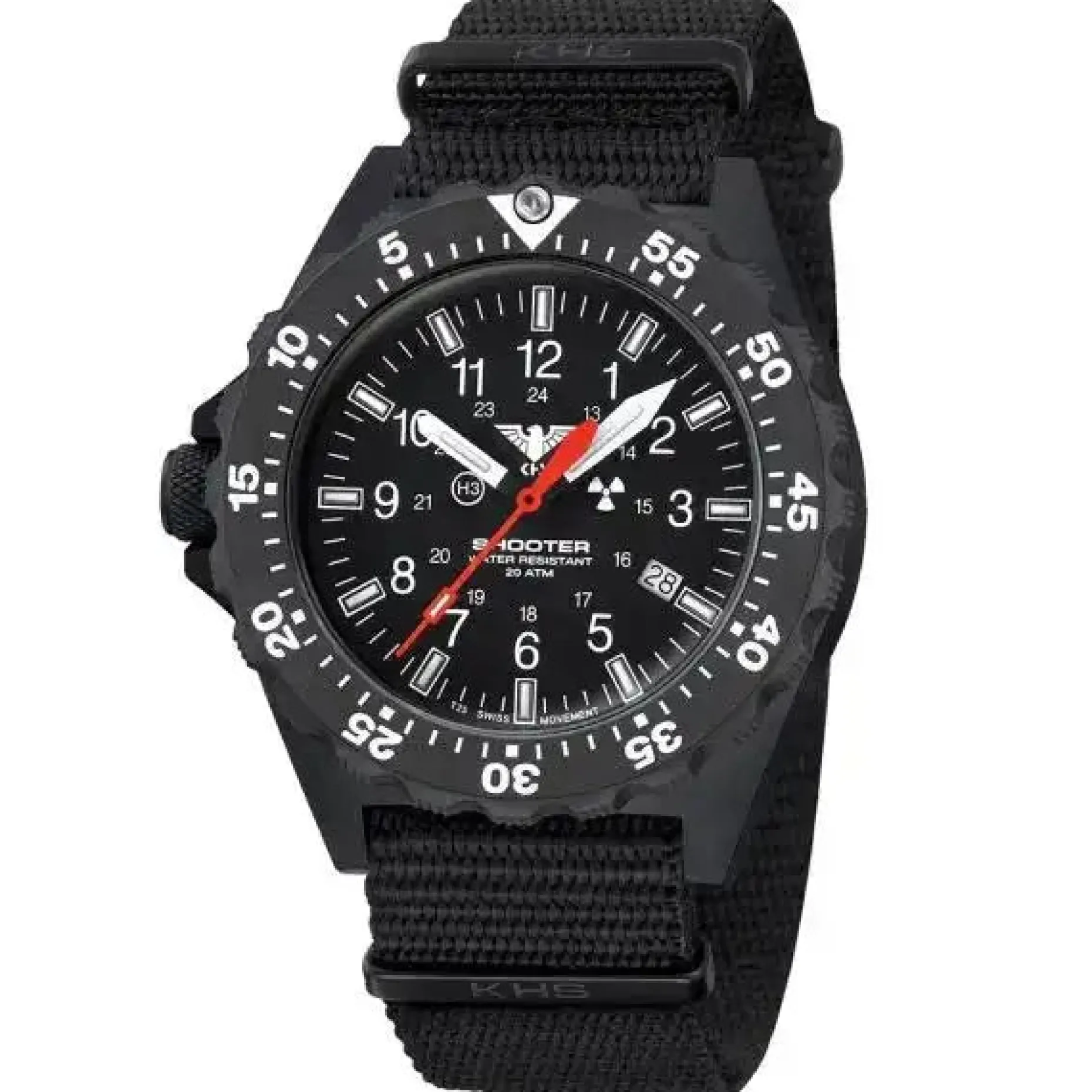 – Zifferblatt und Zeiger: matt schwarzes Zifferblatt mit arabischen Ziffern und Datumsfenster, 3 Zeiger (Stunde, Minute und Sekunde), roter Sekundenzeiger für taktische sekundengenaue Einsätze.