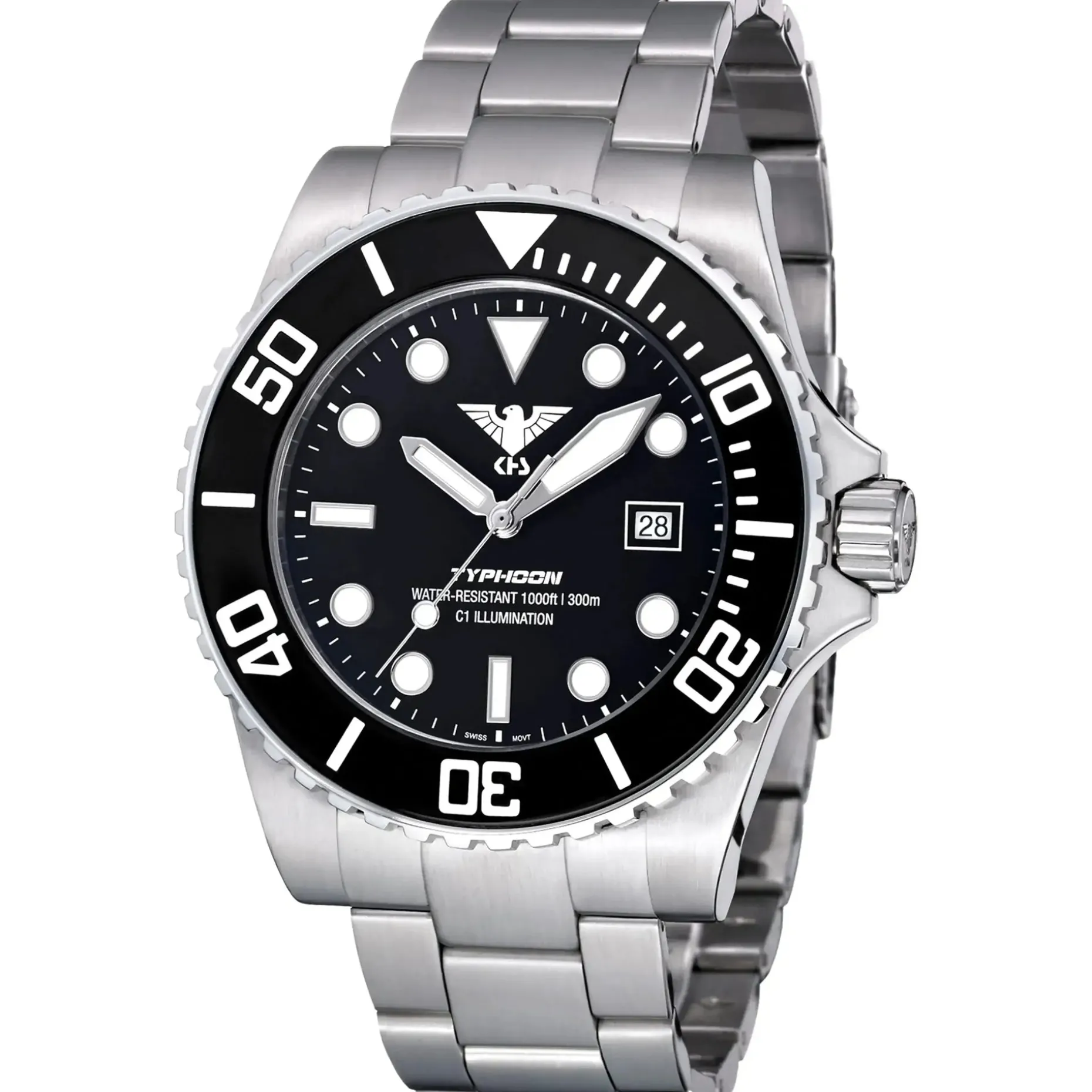 Mit einem Gehäuse aus Chirurgenstahl, einer maximalen Tauchtiefe von bis zu 30 Bar / 300 Meter und einem kratzfestem Saphirglas ist die neue KHS Typhoon die ultimative Taschenuhr für Profis und Abenteurer! Selbst in absoluter Finsternis ist die Uhr, dank modernster C1 Leuchtmasse, in allen Konstellationen gut ablesbar. Völlig neu in dieser innovativen KHS Modellklasse ist die erstmalig vollständig illuminierte C1 Drehlünette. Selbstverständlich fehlt auch ein Heliumventil für große Tiefen nicht. Die Modellserie “Typhoon“ entspricht in allen Anforderungen der U.S.-Army-Spezifikation MIL-W-46374F für Spezialeinheiten.