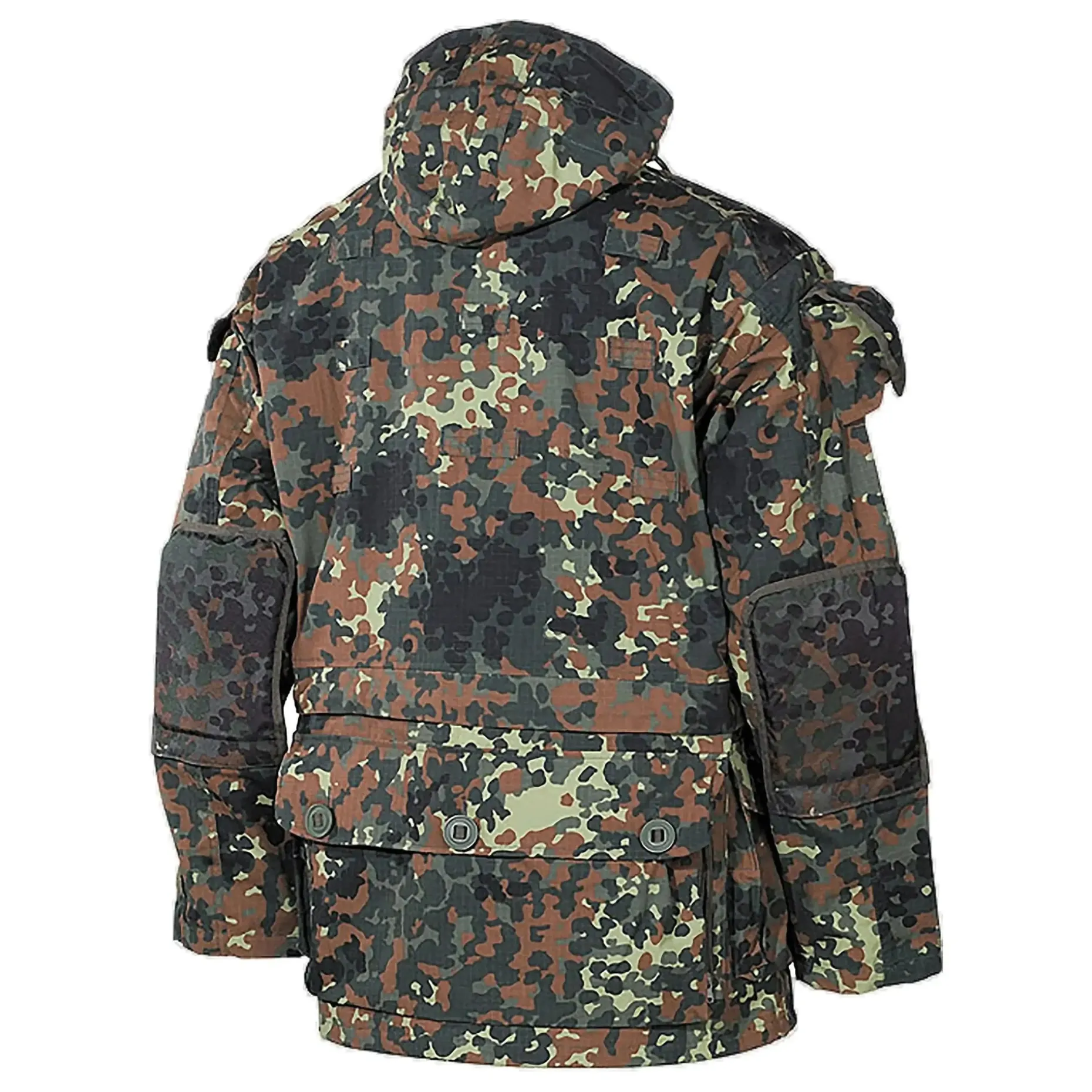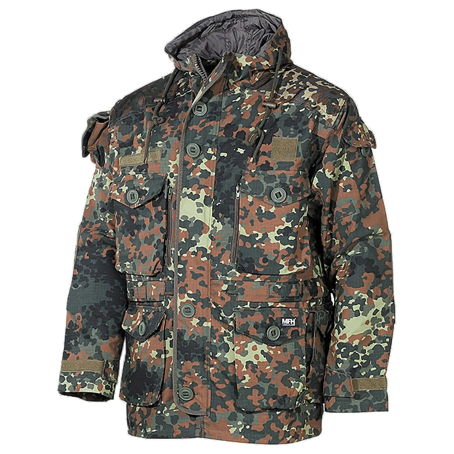 Die Kommandojacke Smock von MFH ist eine preiswerte Feldjacke für den täglichen Gebrauch. Diese Alljahresjacke überzeugt nicht nur mit unzähligen Verstaumöglichkeiten, sondern auch durch Funktionalität. Durch den verdeckten 2-Wege-Frontreißverschluss mit zusätzlicher Knopfleiste sowie an den Ärmeln durch elastische Bündchen kann kein Wind eindringen. Weiterhin kann die Jacke durch Anbringen von Patches und Abzeichen auf Klettbändern individualisiert werden. Die Ellbogenpolsterung kann bei Bedarf entfernt und die Kapuze durch den eingearbeiteten Drahtbügel reguliert werden.