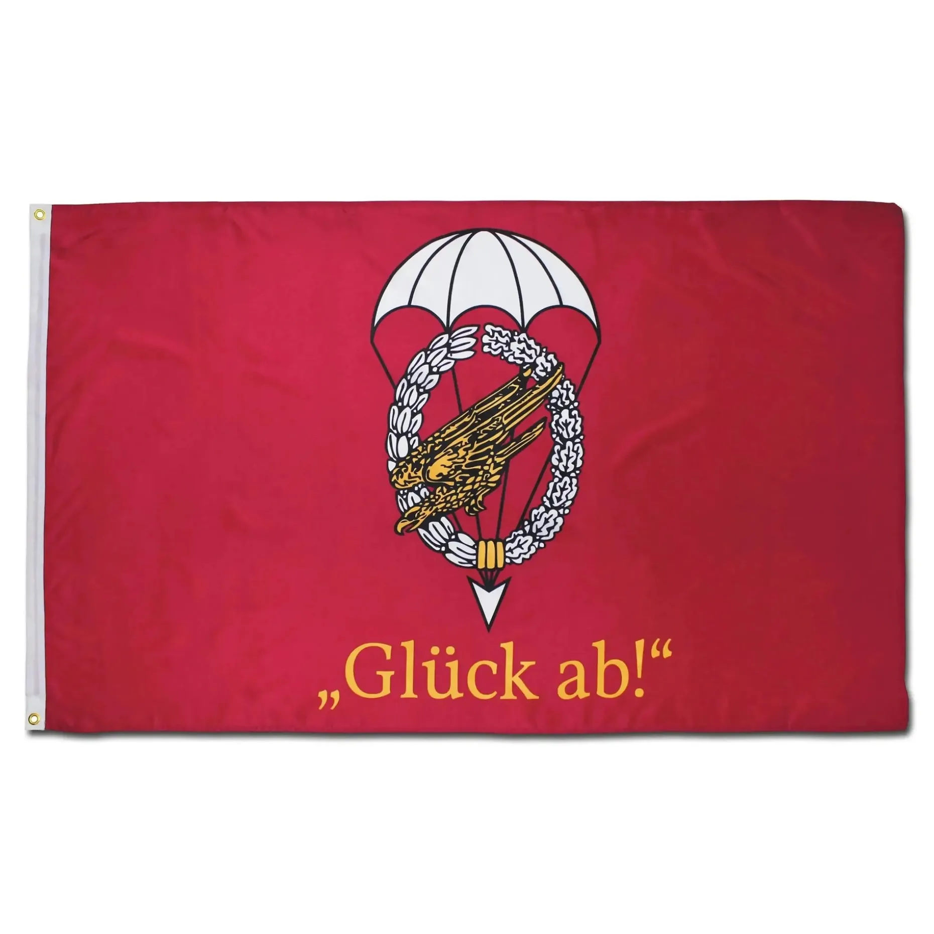 Dank ihrer wind-, wetter- und lichtfesten Eigenschaften eignet sich die Flagge Fallschirmjäger Glück Ab perfekt für den Einsatz im Freien. Selbst bei leichter Brise wird das leichte Polyestermaterial sanft im Wind wehen. Durch das beidseitige Druckverfahren kannst Du die Flagge von beiden Seiten ansehen.