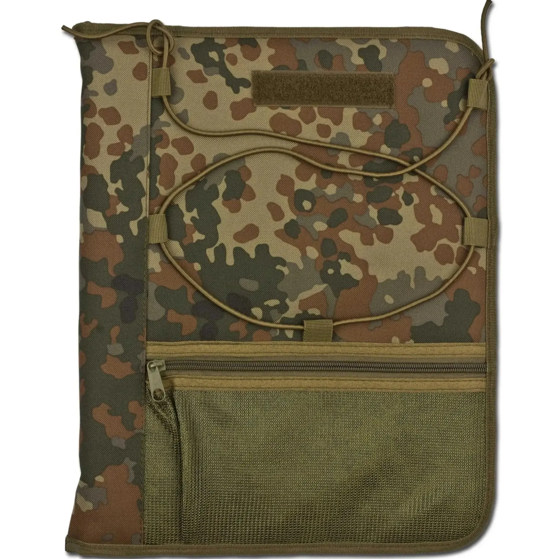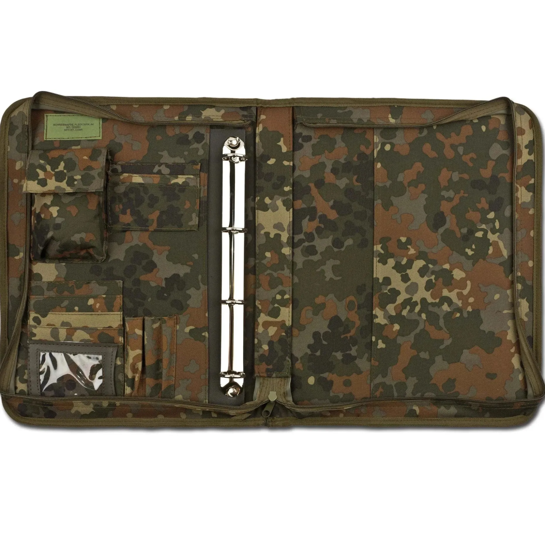 Die MFH Schreibmappe ermöglicht Dir das organisierte Verstauen Deiner Unterlagen. Sie ist ausgestattet mit einer Elastikkordel und einem Netzfach mit Reißverschluss und Klettflauschpatch (ca. 9 x 2,5 cm) vorne. Außerdem ist sie komplett aufklappbar und in folgende Fächer unterteilt: