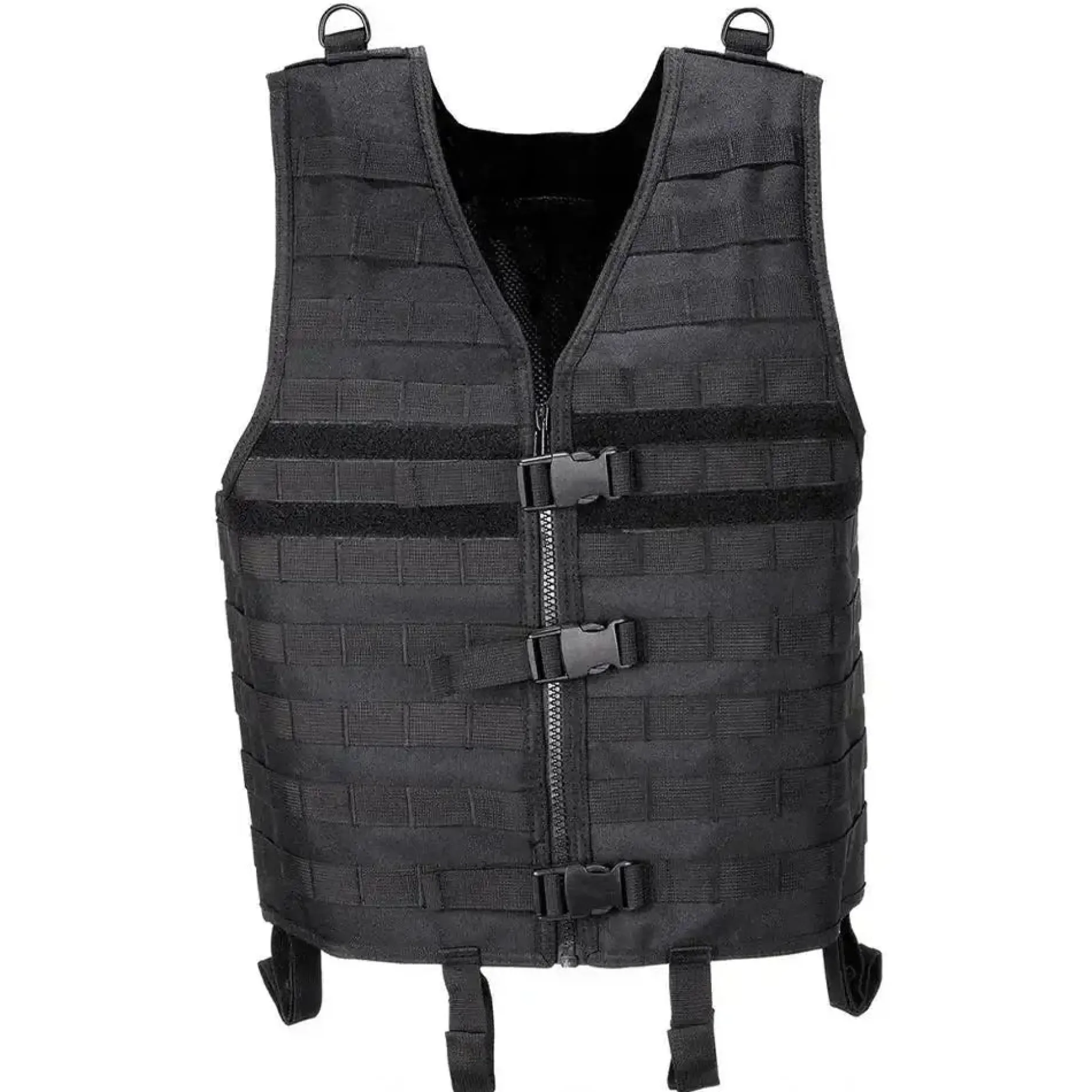 Die MFH Molle light ist eine taktische Weste, die vorne und hinten mit Molle-Aufnahmeschlaufen ausgerüstet ist und somit das Anbringen zahlreicher Ausrüstung wie beispielsweise Taschen erlaubt. Im Inneren sind zudem drei große Netztaschen mit Reißverschluss oder Klett verarbeitet. Die Weitenregulierung an der Seite mit Bändern und die Höhenverstellbarkeit an der Schulter mit Klettverschluss und D-Ring aus Metall garantieren einen individuellen Tragekomfort. Auf der Rückseite ist sie mit einem Rettungsgriff ausgestattet. Sechs Schlaufen am Bund mit Druckknopf und Klett ermöglichen die Befestigung am Gürtel. Ein stabiler Front-Reißverschluss, Klettflauschpatches auf der Brust und dem oberen Rücken und ein Clipverschluss runden die Weste ab.