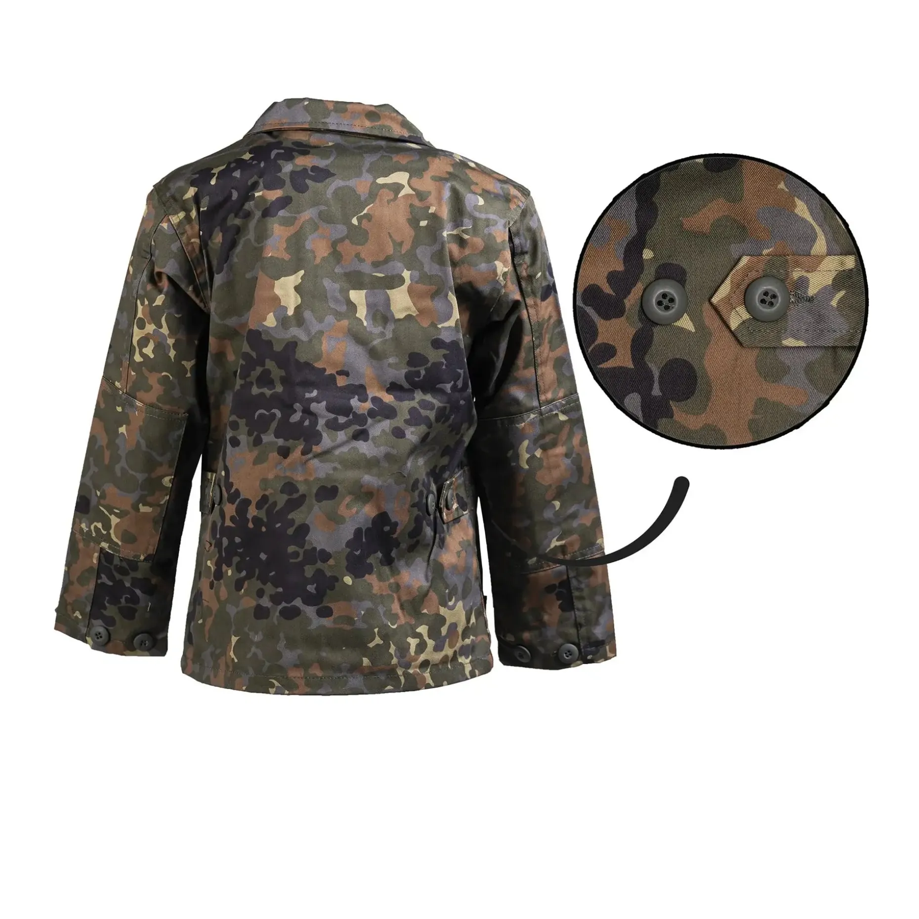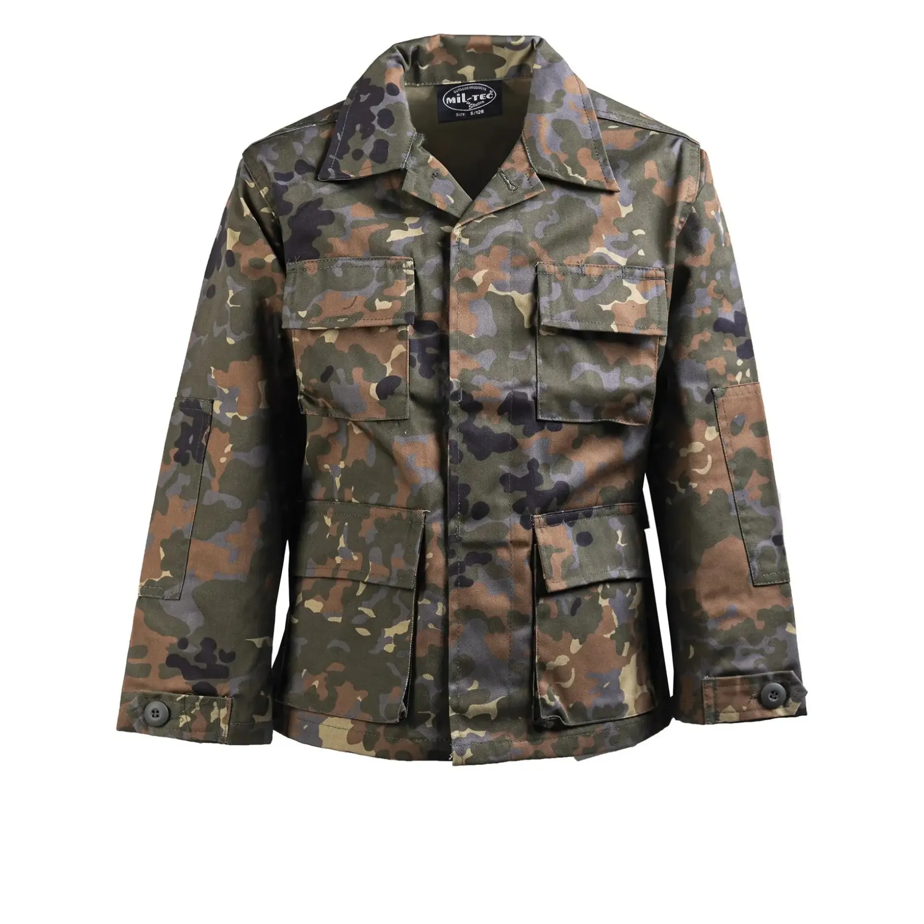 Die US BDU Jacke Kids im Flecktarn-Design bringt den beliebten Militär-Look auch in Kindergrößen – perfekt für kleine Abenteurer mit großem Tatendrang. Das robuste Gewebe aus 65 % Polyester und 35 % Baumwolle ist angenehm zu tragen und hält den Belastungen beim Spielen, Klettern und Toben problemlos stand.