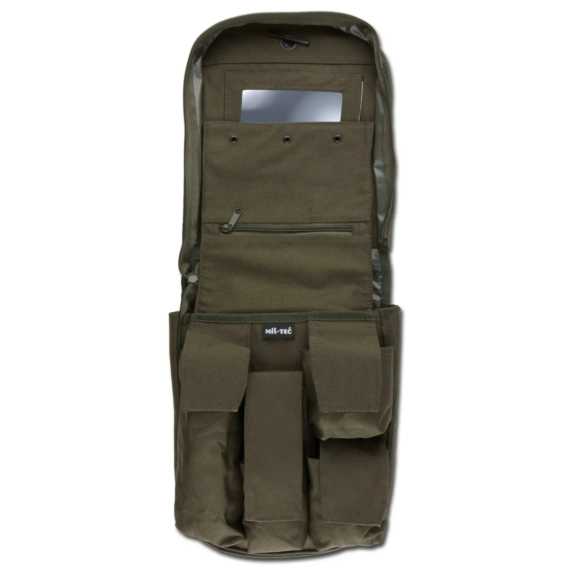 Waschzeugtasche mit vielen Unterteilungen und großem Stauraum für ein Handtuch. Inklusive unzerbrechlichem Spiegel (befindet sich im Spiegelfach mit einer Schutzabdeckung!), Tragegriff und Aufhängehaken. Umlaufender Reißverschluss. Seitliche Belüftungsösen.