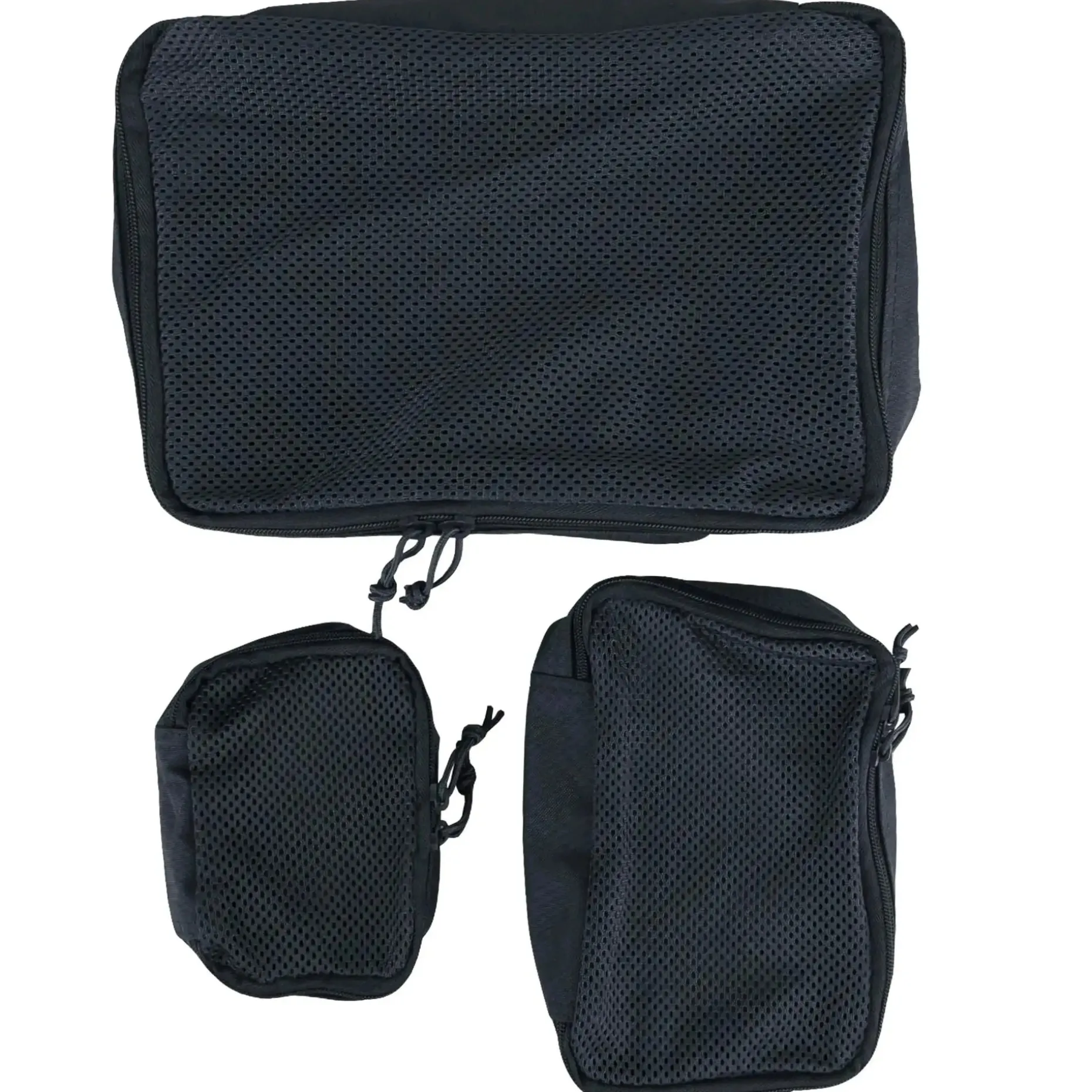 Das Set besteht aus drei praktischen Netztaschen in verschiedenen Größen. Sie eignen sich ideal zum Sortieren und Verstauen Ihrer Ausrüstung bzw. Bekleidung bei Reisen, sodass keine Unordnung in Koffer oder Tasche entstehen. Der Taschendeckel ist aus luftduchlässigem Mesh-Material, während die Seiten und der Boden geschlossen sind. So kann auch nichts verloren gehen.