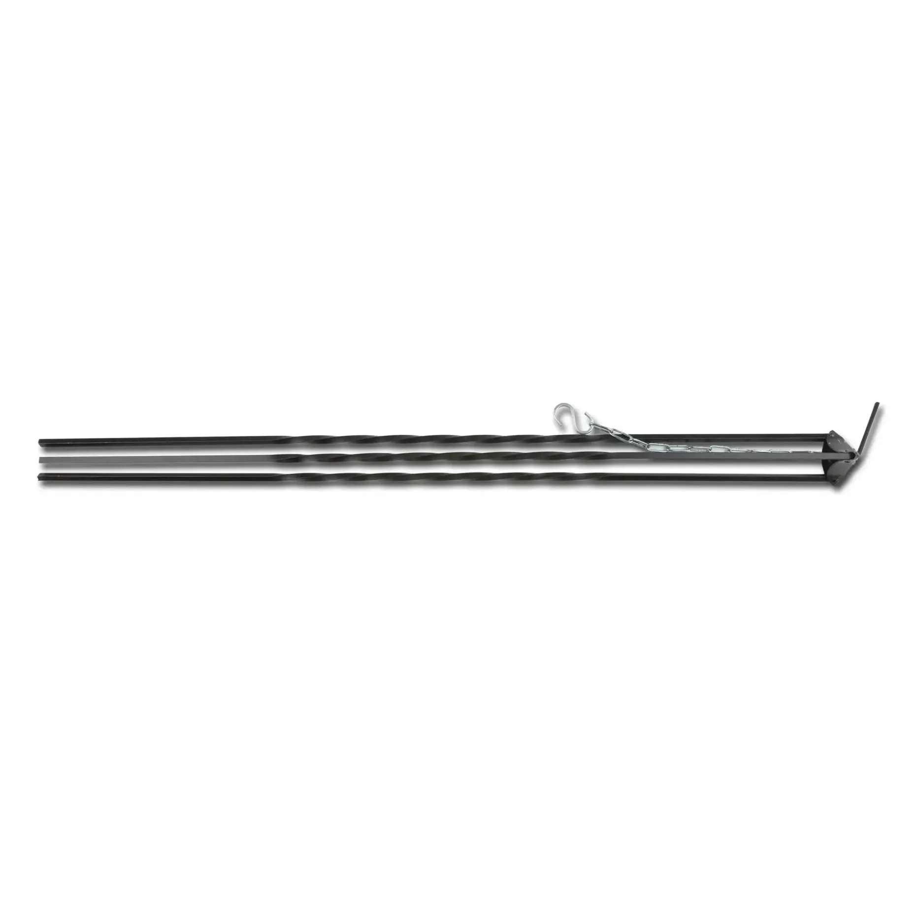 Robustes Dreibein mit schwarz eloxierter Oberfläche zum Schutz gegen Hitze und widrige Wetterbedingungen. Am oberen Ende ist ein beweglicher Hebel angebracht, der die Hängekette in eine Drehbewegung versetzt, dies spart dauerndes Umrühren. Ein S-förmiger Karabiner zum Einhängen des Kessels ist im Lieferumfang enthalten.