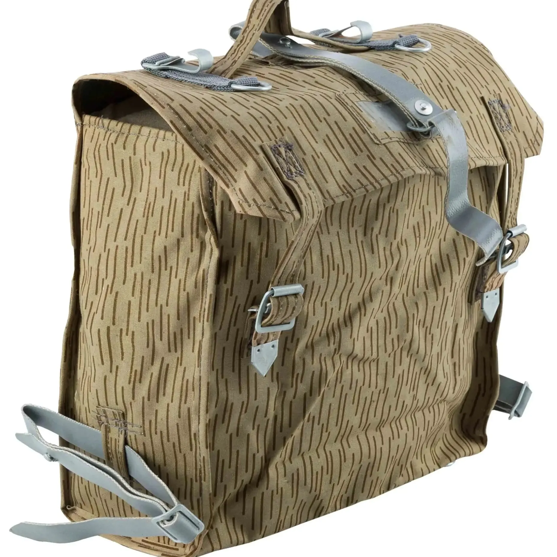 Das Sturmgepäck aus originalen Beständen der Nationalen Volksarmee (NVA) kann dank Y-Tragegestell als Rucksack getragen werden oder wie eine Tasche am Trageriemen. Weiterhin bieten die Schnallen die Möglichkeit, das Sturmgepäck mit einem Koppeltragegestell zu kombinieren