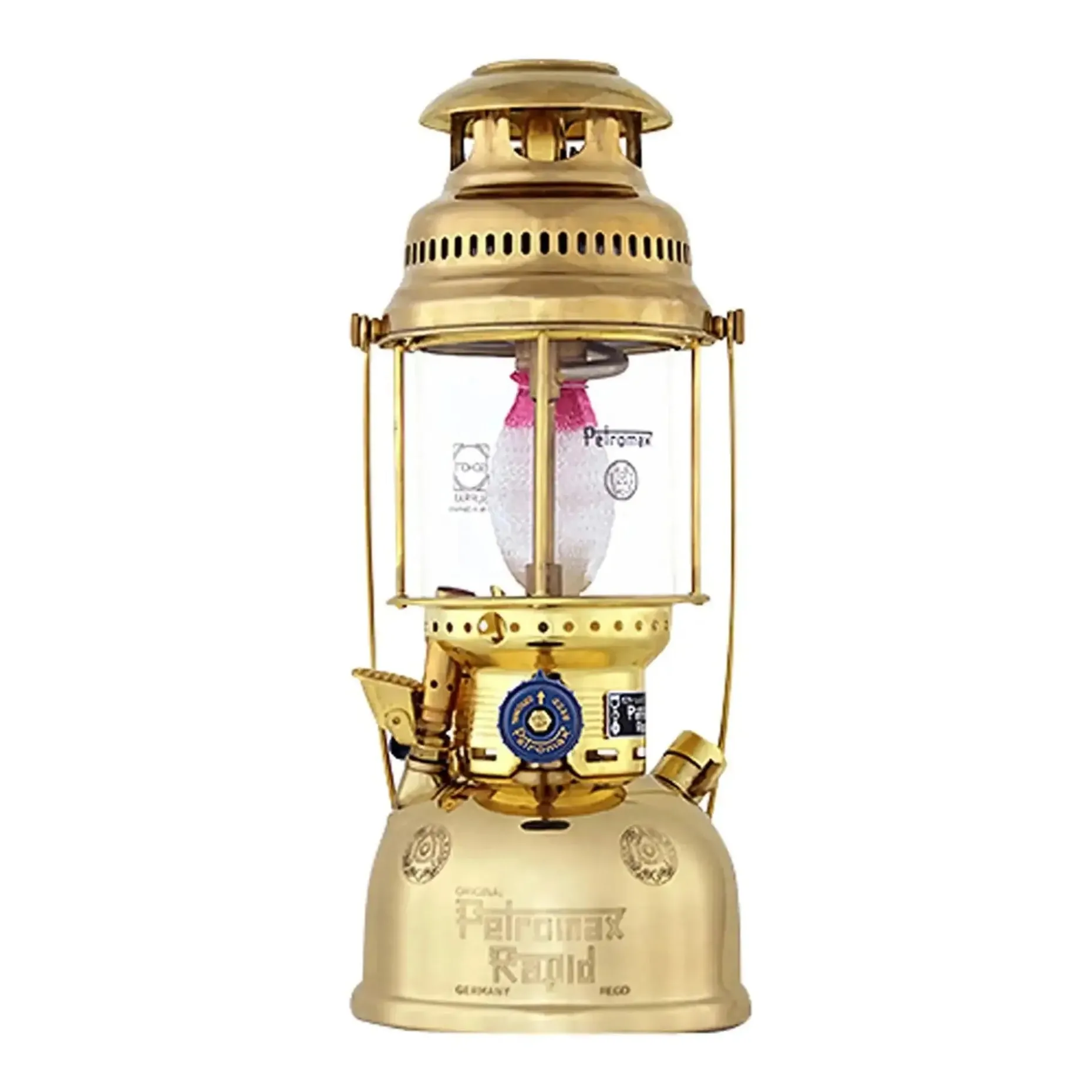 Das Petroleum wird unter Druck in einen Vergaser geleitet und der verdampfende Brennstoff sorgt in Verbindung mit dem mit Leuchtsalzen imprägnierten Glühstrumpf für ein helles, warmes Licht. Petromax Lampen werden in Handarbeit aus über 200 Einzelteilen zusammengesetzt.