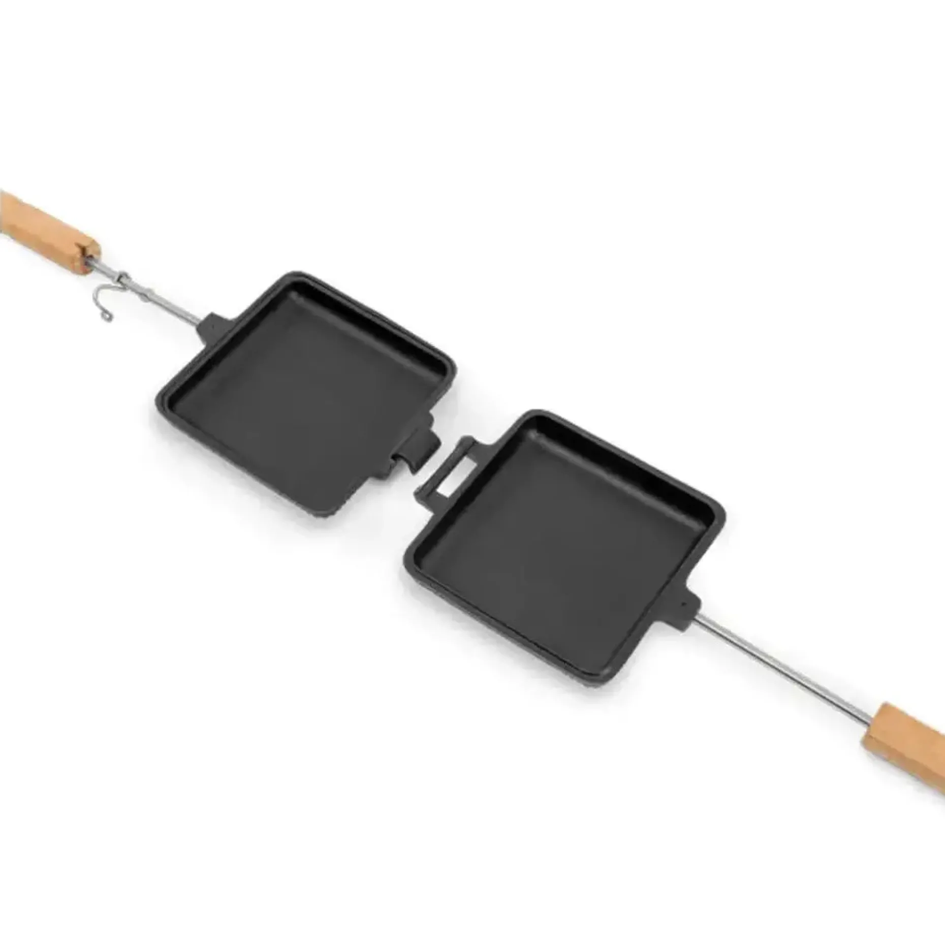 Die Reinigung des mit seasoned finish behandelten Sandwicheisen ist dank natürlichen Antihaft-Effekts einfach. Die Gusshälften am Scharnier trennen und dann säubern.