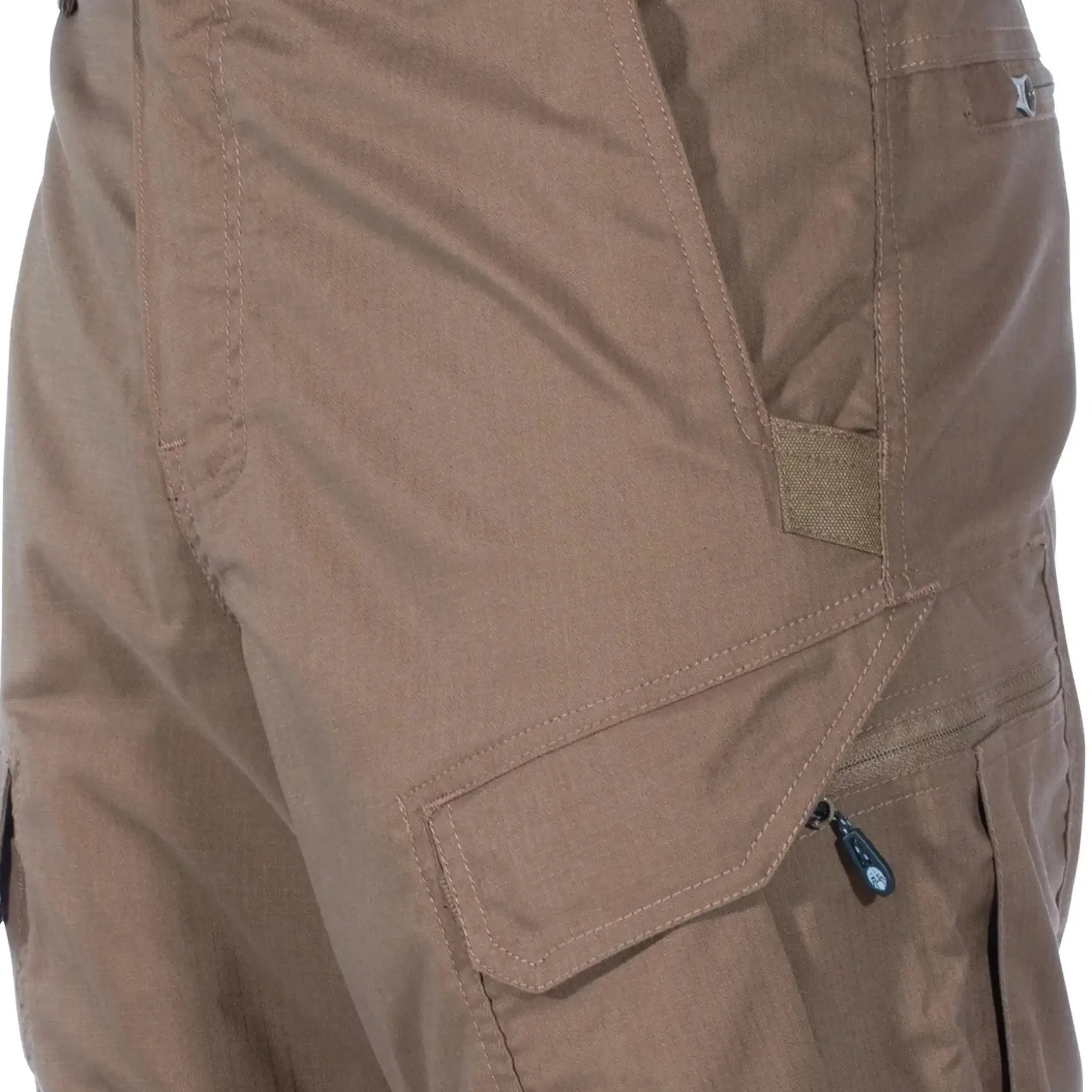 Die durchdachte Taschenkonfiguration der Seitentaschen sorgt dafür, dass die Ausrüstung weg vom Oberschenkel platziert ist und Du maximale Bewegungsfreiheit genießt. Der zusätzliche Reißverschluss verhindert das Herausfallen von Kleinteilen wie Messer, Schlüssel etc. Wenn Du ein 5.56 mm Magazin unterbringen willst, lässt Du den Reißverschluss offen und schließt nur den Klettverschluss darüber. Die Gürtelschlaufen sind mit 60 mm extra breit, sodass Du neben Deinem normalen Gürtel auch einen Tactical Belt einschlaufen kannst.
