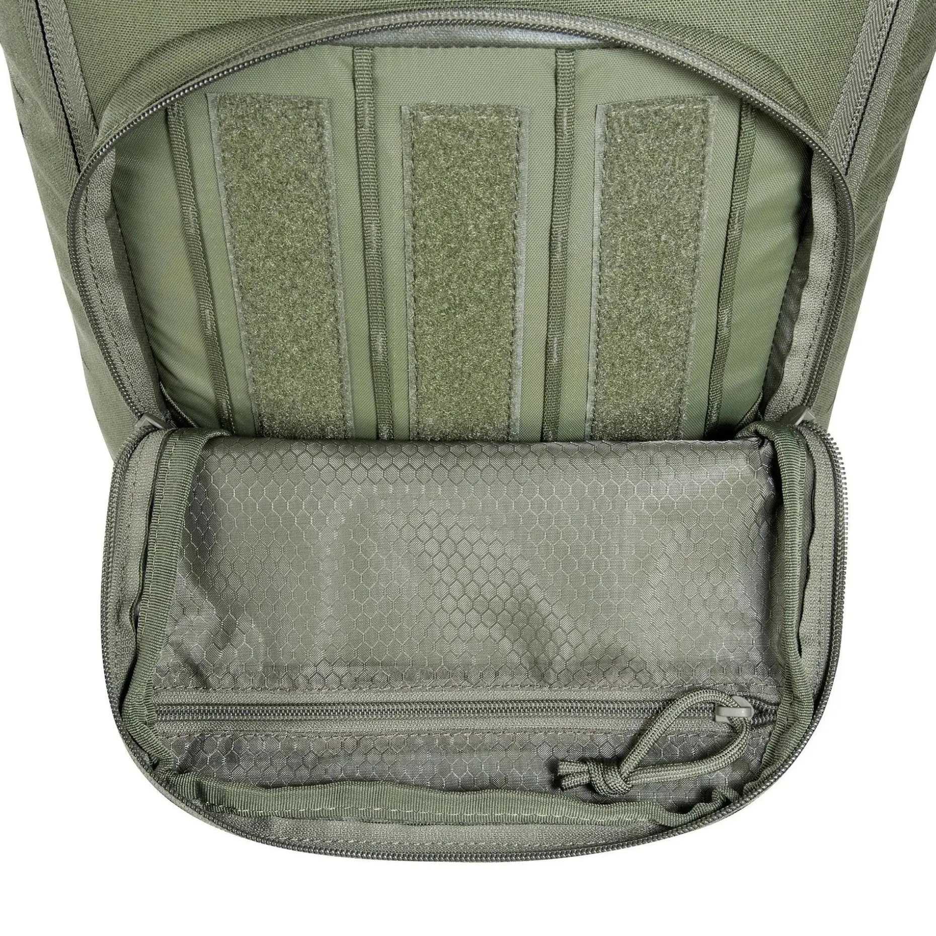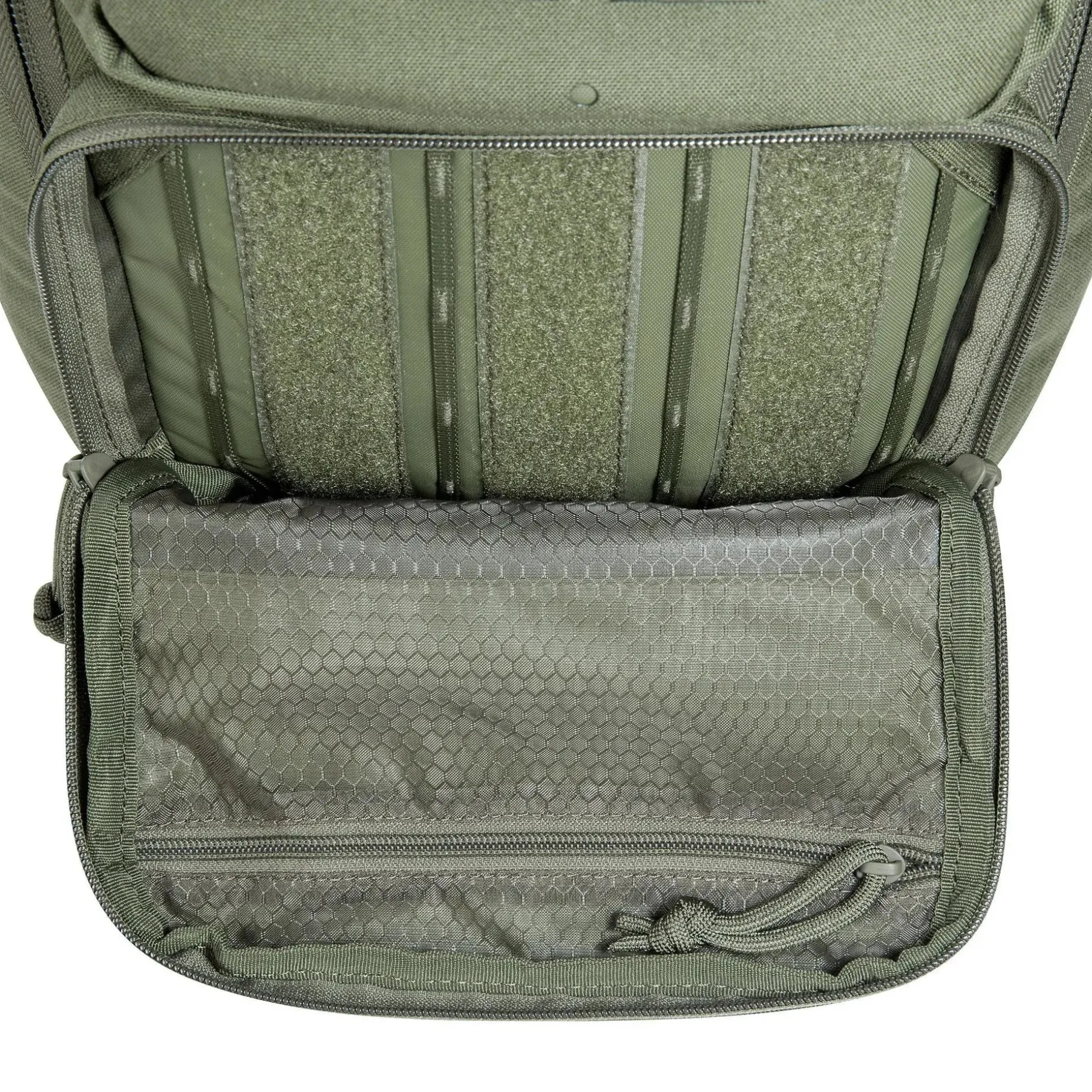 - Große, weit zu öffnende Deckelklappe mit Klettflächen und Daisy-Chain-System innen