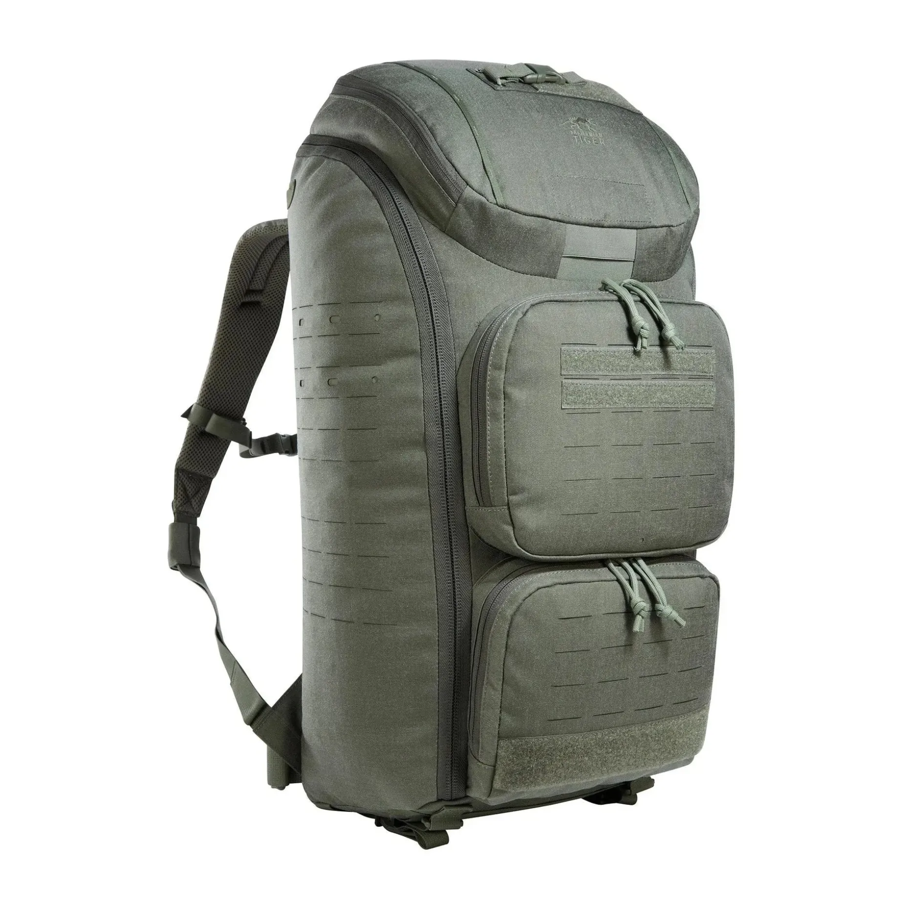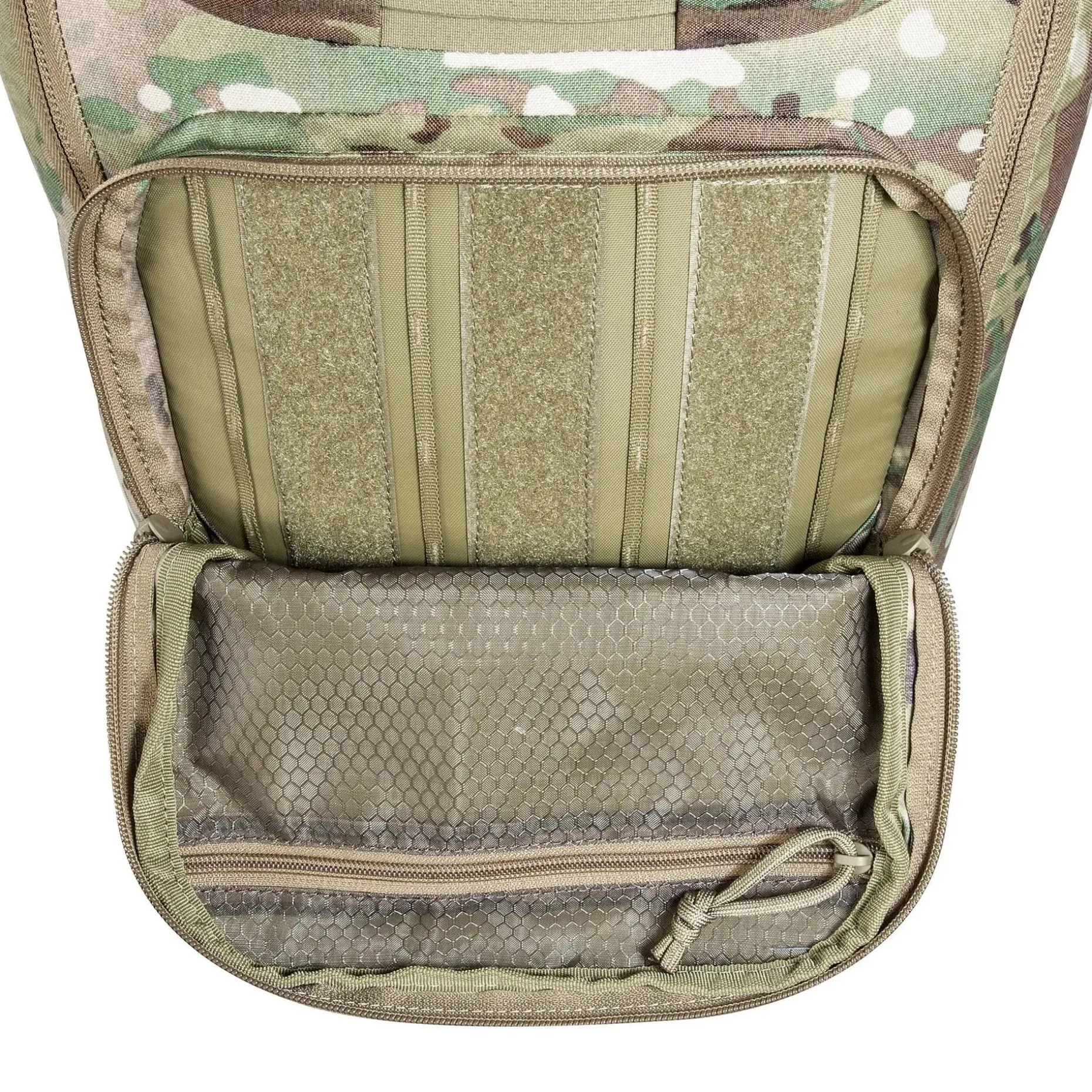 Der abnehmbare Hüftgurt sorgt für zusätzliche Stabilität beim Tragen, und die mitgelieferten Adapterbänder ermöglichen das Einschlaufen des Rucksacks an Schutzwesten. Für noch mehr Anpassungsfähigkeit sorgt das Lasercut-MOLLE-System auf Front und Seiten, das Dir erlaubt, weiteres Zubehör anzubringen. Der große Henkelgriff ermöglicht das Tragen in geöffnetem Zustand, ideal für schnellen Zugriff.