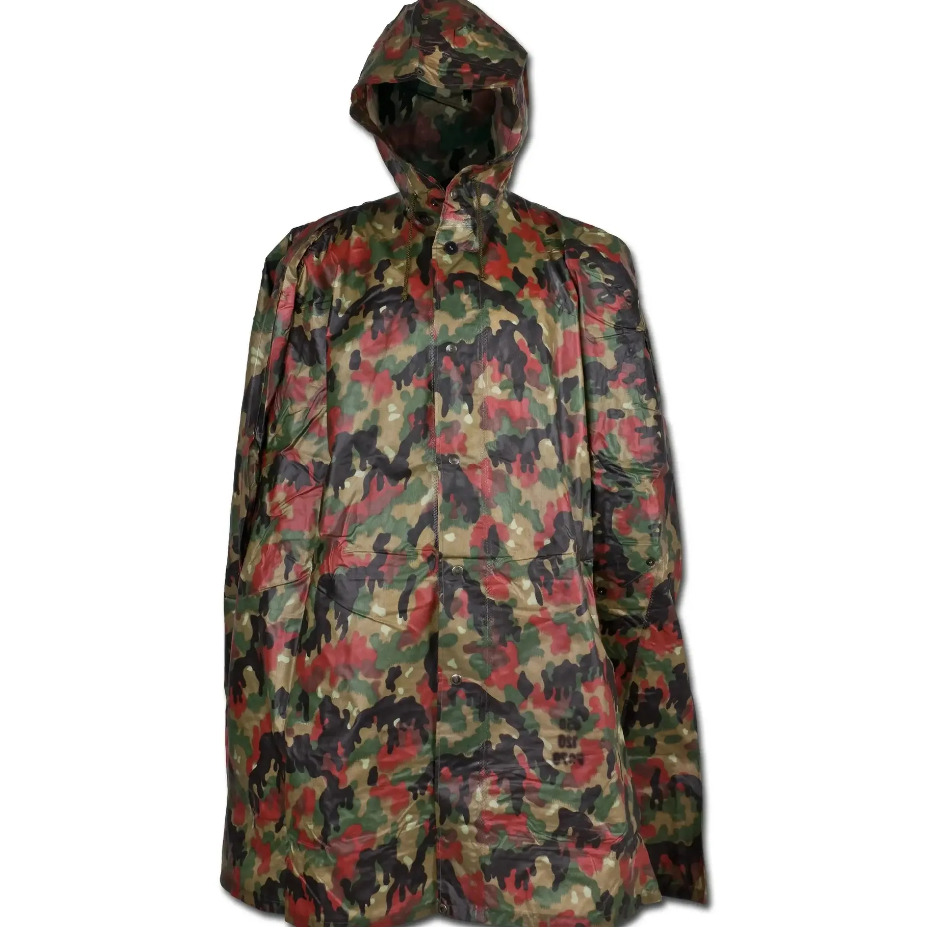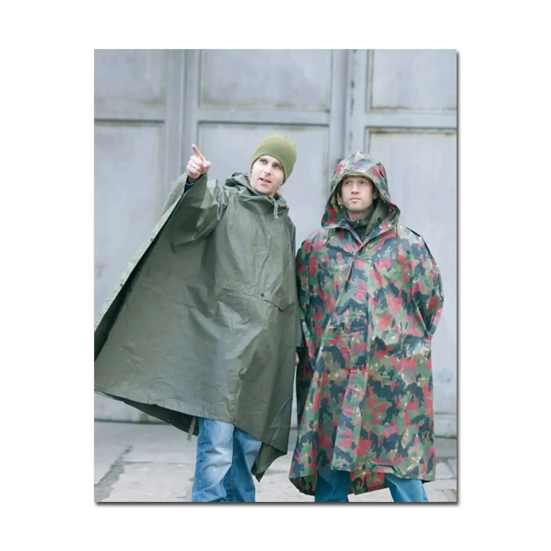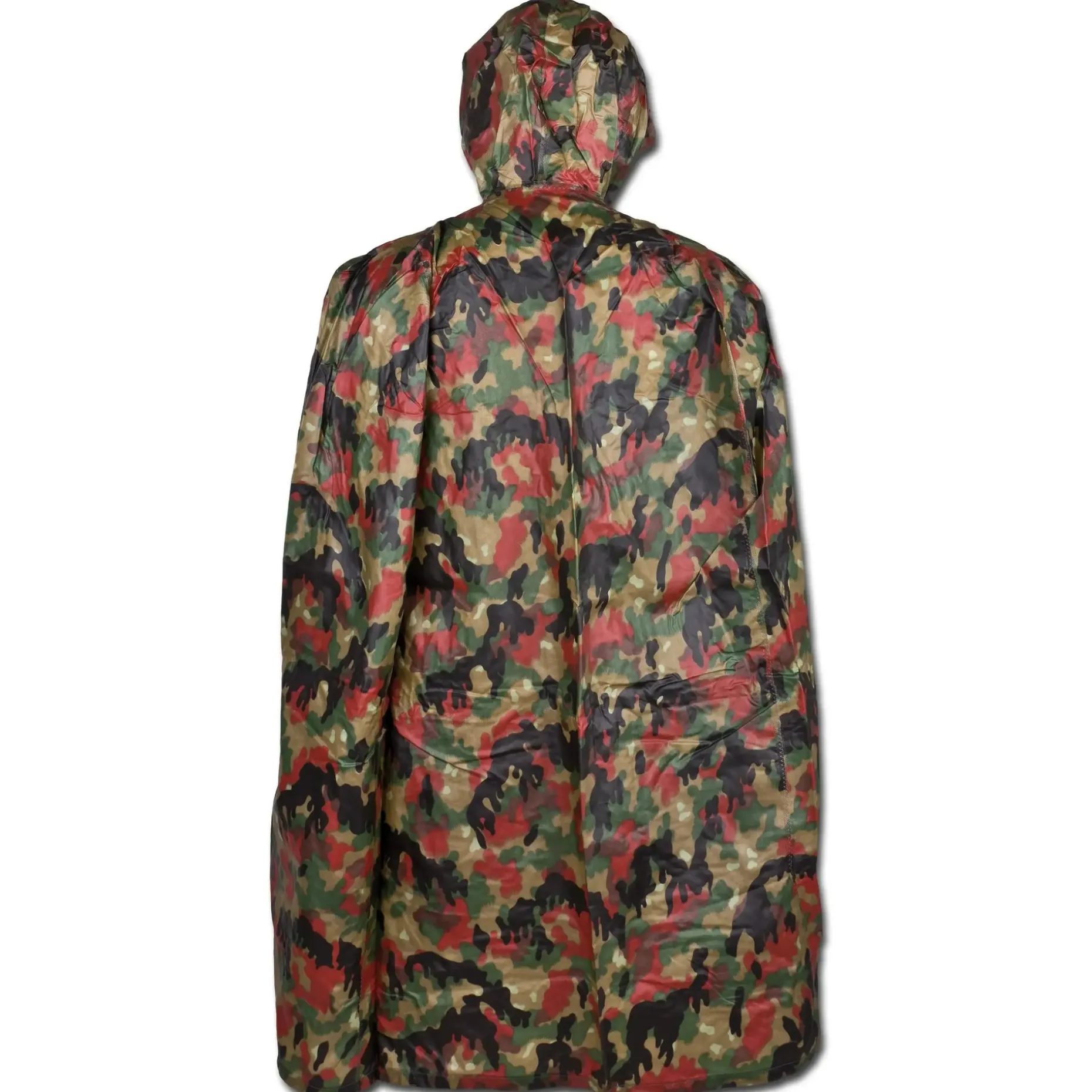 Tarn-Regenumhang (Poncho) aus Beständen der schweizer Armee. Auf dem Foto rechts zu sehen.