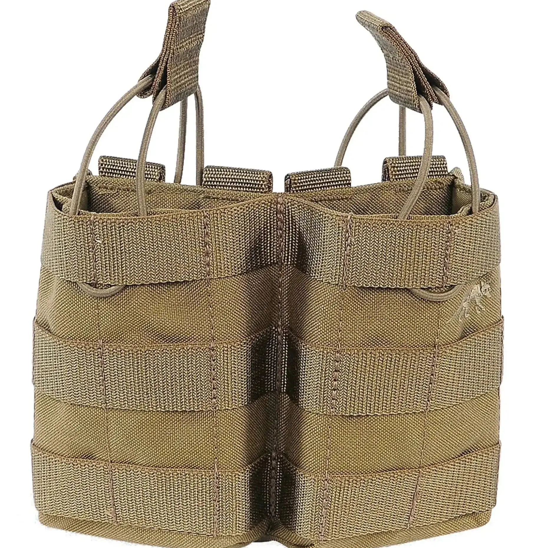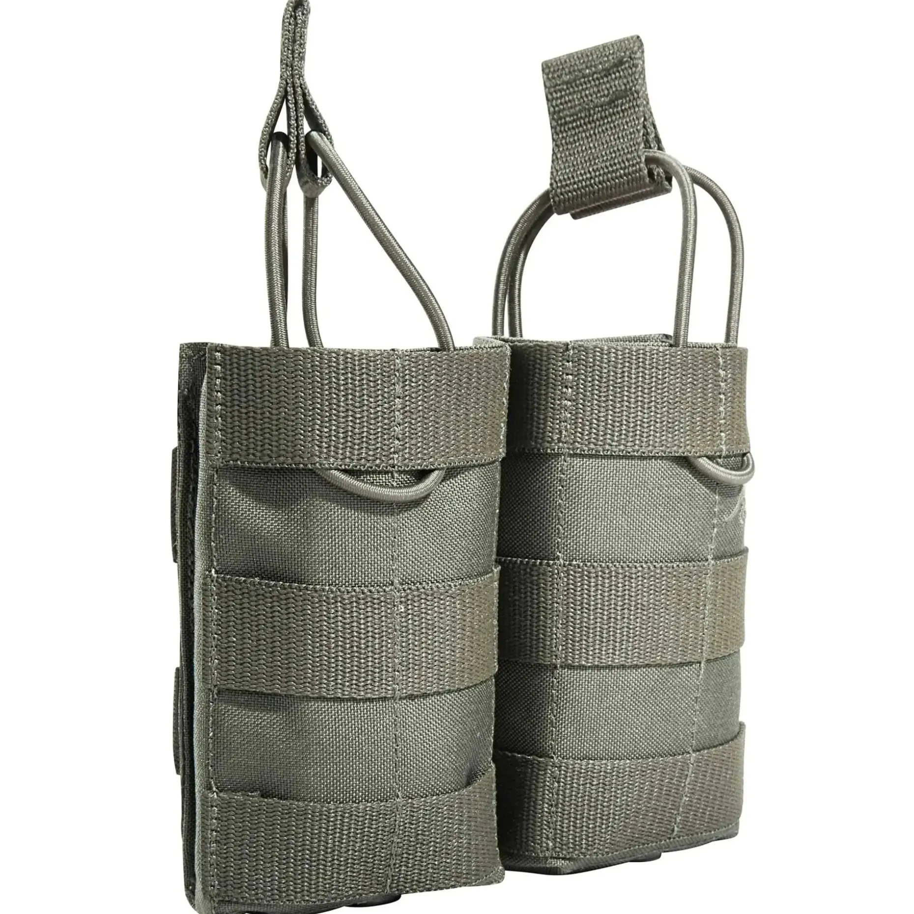 Kurze Magazintasche für zwei Einzelmagazine für M4, AR15 und STG nebeneinander, welche durch Bungee-Cord gesichert werden.