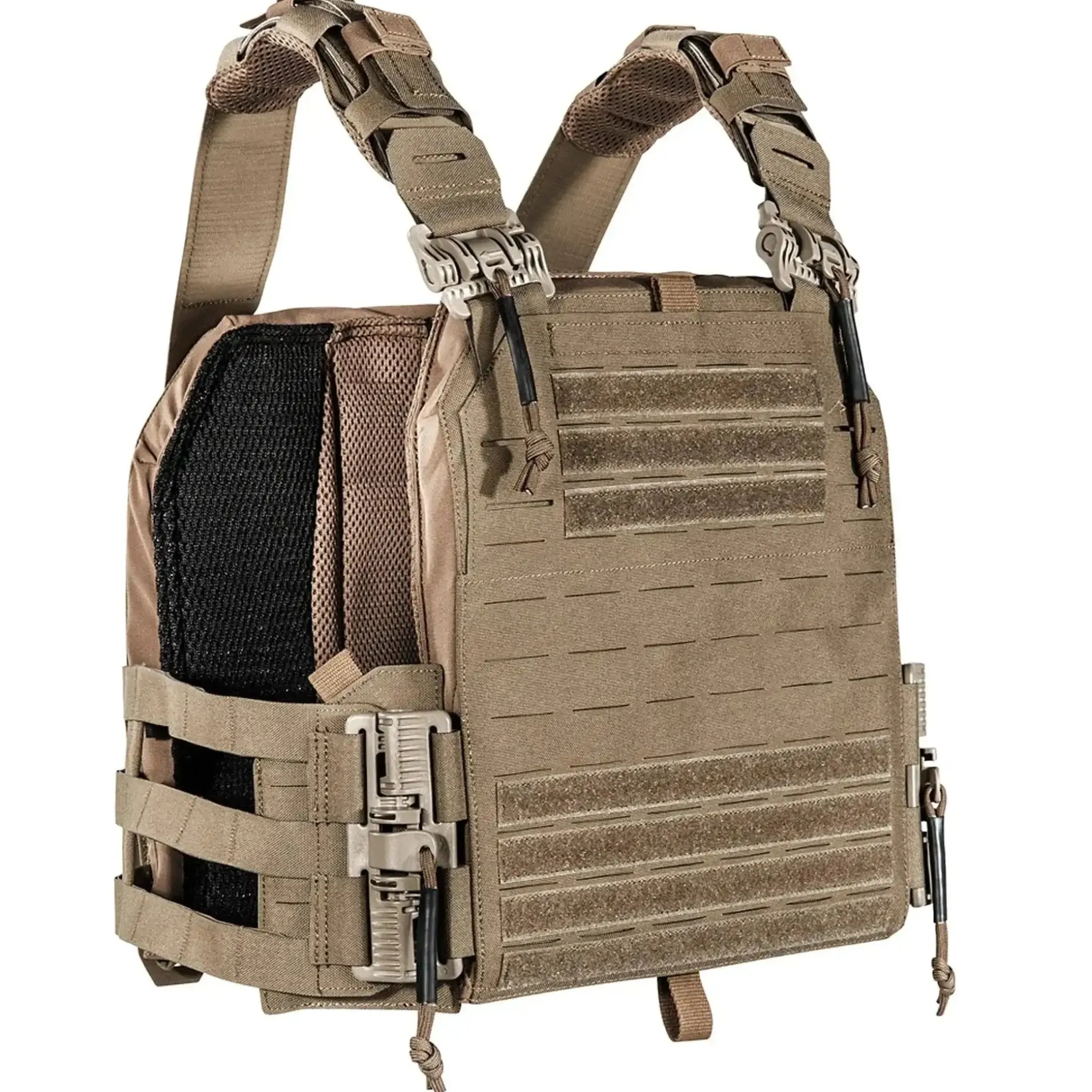 Leichter Plattenträger in Laser Cut-Ausführung mit glatter und aufgeräumter Optik. Die Unisex-Größe ist für SK4-Platten ausgelegt. In der vorderen Kletttasche lassen sich weitere Kleinteile unterbringen. Durch das Schnelllösesystem der ROC-Schließe wird das Anziehen erleichtert. Die Seitenteile lassen sich austauschen, sodass Pouches für ballistische Seitenplatten oder geschlossene Laser Cut Flächen verwendet werden können. Die Schultergurte verfügen über verriegelte Nähte, sodass sie nach Anpassung zugeschnitten werden können.