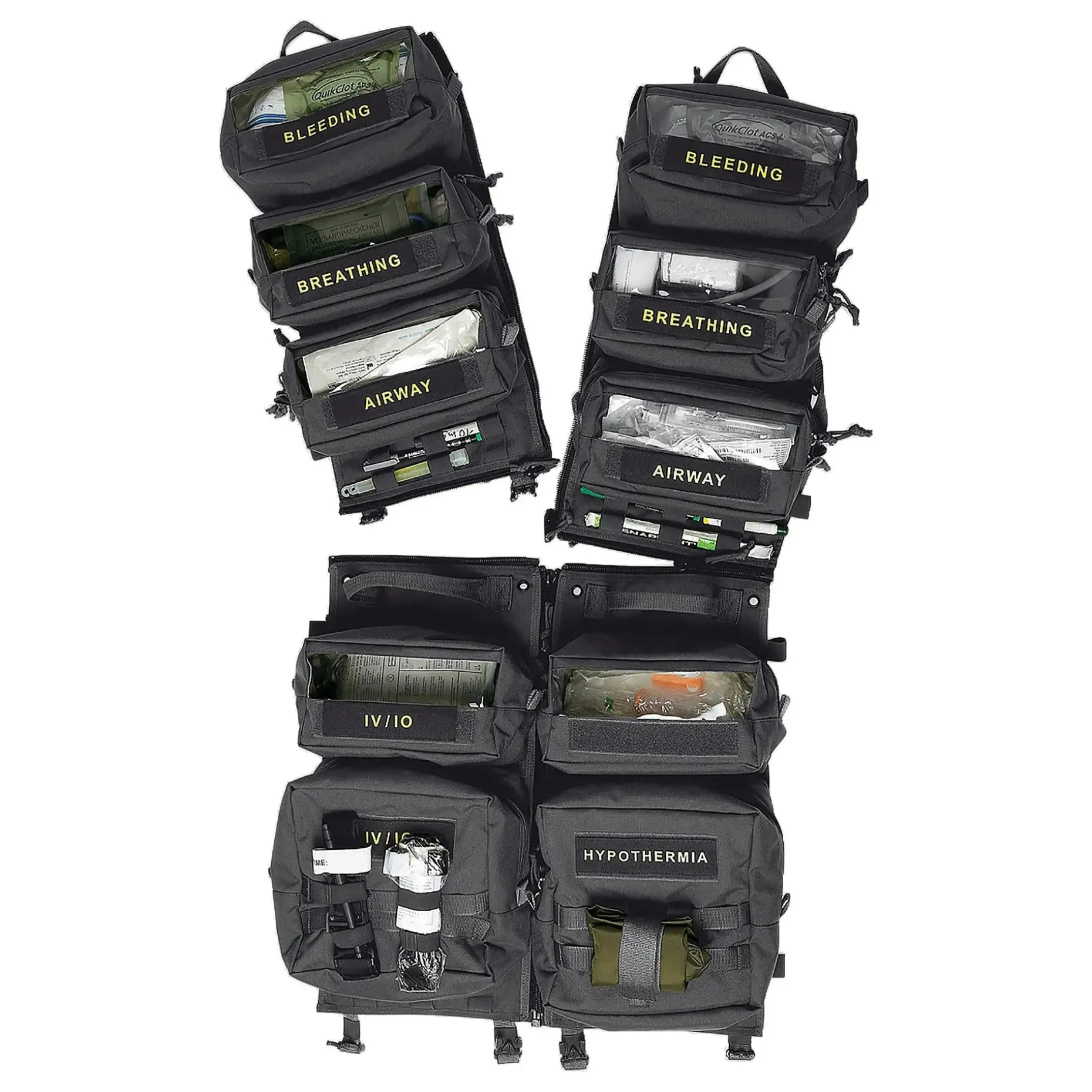 Die Einzelpanels können individuell bestückt und zum Beispiel in Fahrzeugen, Helikoptern usw. untergebracht werden. Die Klarsicht- und Einzeltaschen lassen sich nach Wunsch sortieren und verwenden. Die mitgelieferte Beschriftung ermöglicht die schnelle und übersichtliche Kennzeichnung. Auf der Rückseite der Einzelpanels sind Einschubfächer angebracht, in denen flache Ausrüstungsgegenstände verstaut werden können. Sind alle Panels verbunden, kann das gesamte Paket zusammengerollt, mit Steckschnallen komprimiert und an den Griffen transportiert werden.