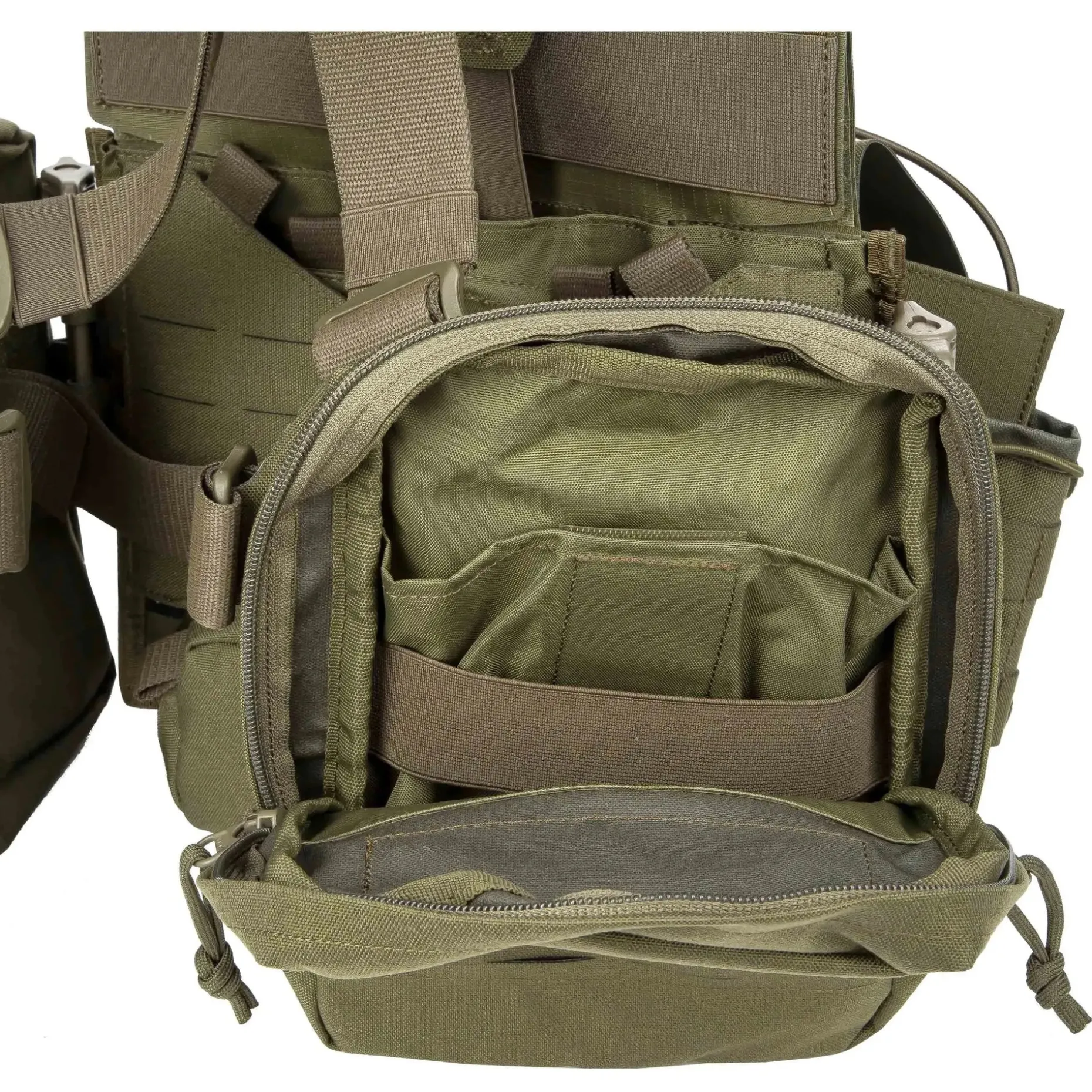 Bereits im Lieferumfang enthalten sind drei komprimierbare Doppelmagazintaschen, geeignet für G36-, AR15- und vergleichbare Magazine. Ergänzt wird das Setup durch zwei fest montierte seitliche Mehrzwecktaschen, die sich auch zur Aufnahme ballistischer Seitenplatten eignen.