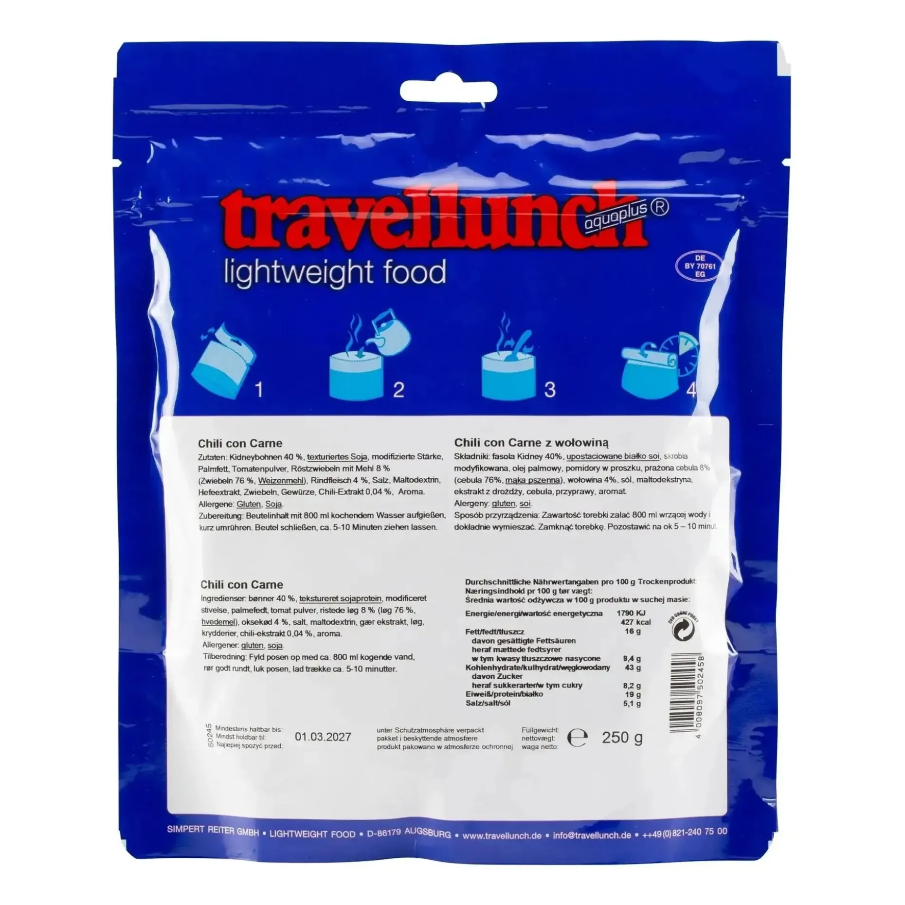 Das Travellunch Chili con Carne 2er Packung ist die ideale Hauptmahlzeit für den Notfall, für den Campingausflug oder für Wanderungen. Es ist nicht nur schmackhaft, sondern stellt auch sicher, dass Du in der freien Natur gut versorgt bist. Hier kommt das leckere Essen im praktischen 2er Pack.