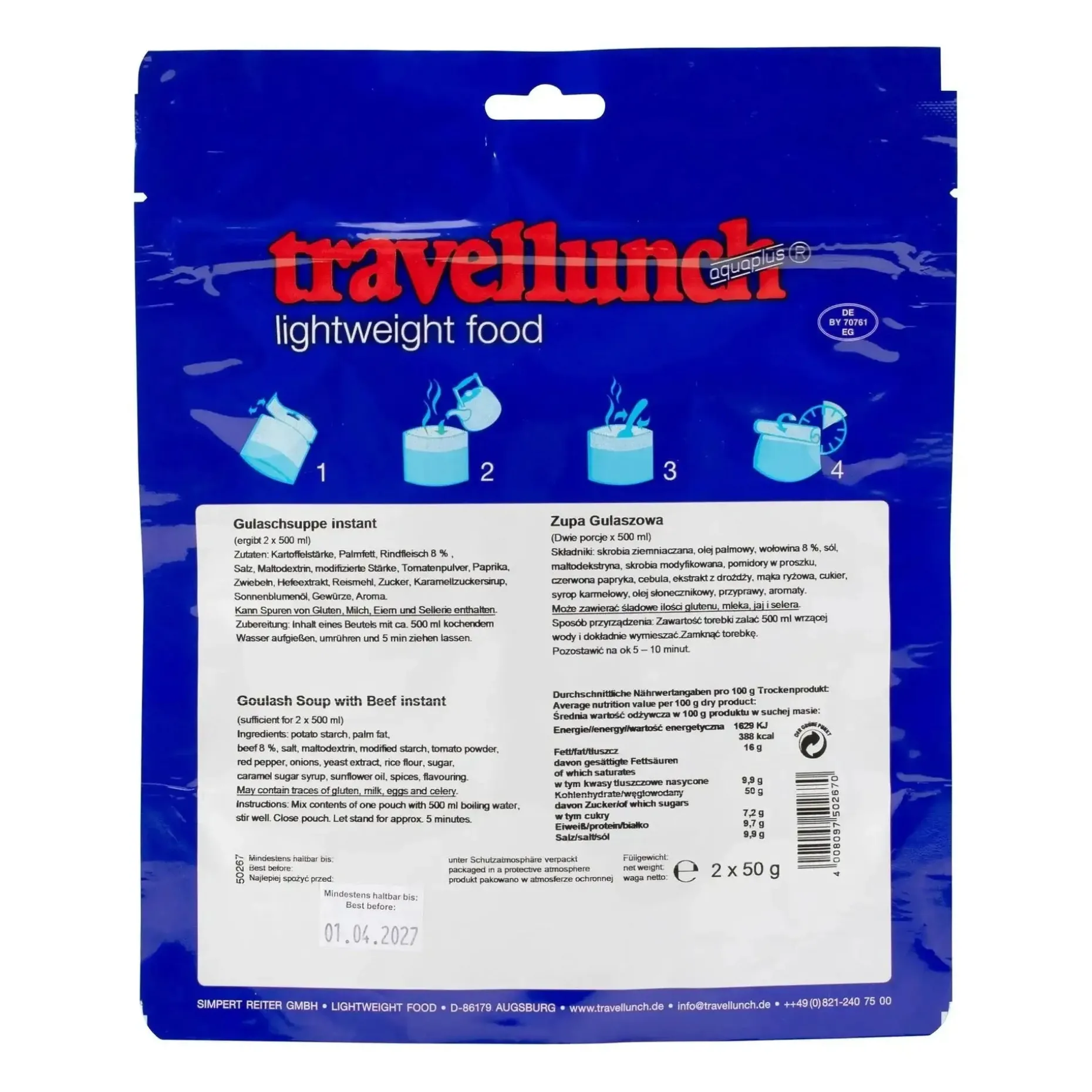 Das Travellunch Gulaschsuppe Instant ist die ideale Hauptmahlzeit für den Notfall, für den Campingausflug oder für Wanderungen. Es ist nicht nur schmackhaft, sondern stellt auch sicher, dass Du in der freien Natur gut versorgt bist.