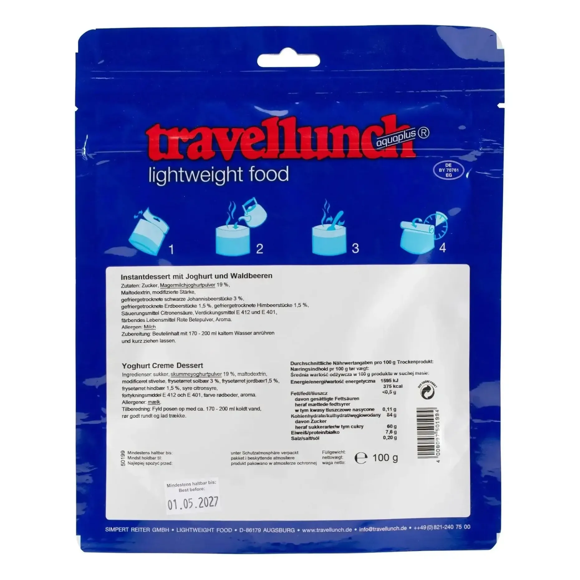Das Travellunch Instantdessert mit Joghurt und Waldbeeren ist die ideale Hauptmahlzeit für den Notfall, für den Campingausflug oder für Wanderungen. Es ist nicht nur schmackhaft, sondern stellt auch sicher, dass Du in der freien Natur gut versorgt bist. Hier kommt das leckere Essen im praktischen 2er Pack.