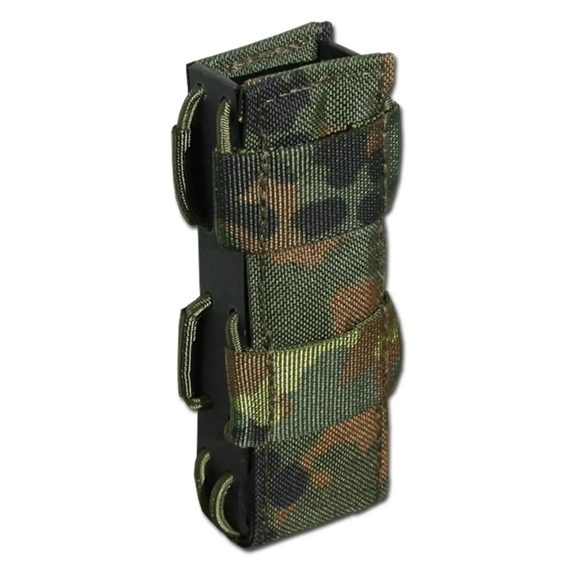 Die Hybridlösung für alle gängigen doppelreihigen Pistolenmagazine wie z.B. die der MP5 oder MP7. Ein sicherer Halt des Magazins sowie die schnelle Zieh- und Rückführungsgeschwindigkeit werden durch ein mit Gummischnüren zusammengedrücktes Kydex Profil erreicht. Eine mit PALs besetzte Cordura Front ermöglicht das Anbringen modularer Taschen. Dieses Multitalent ist daher die beste Allroundlösung für Deine Ausrüstung.